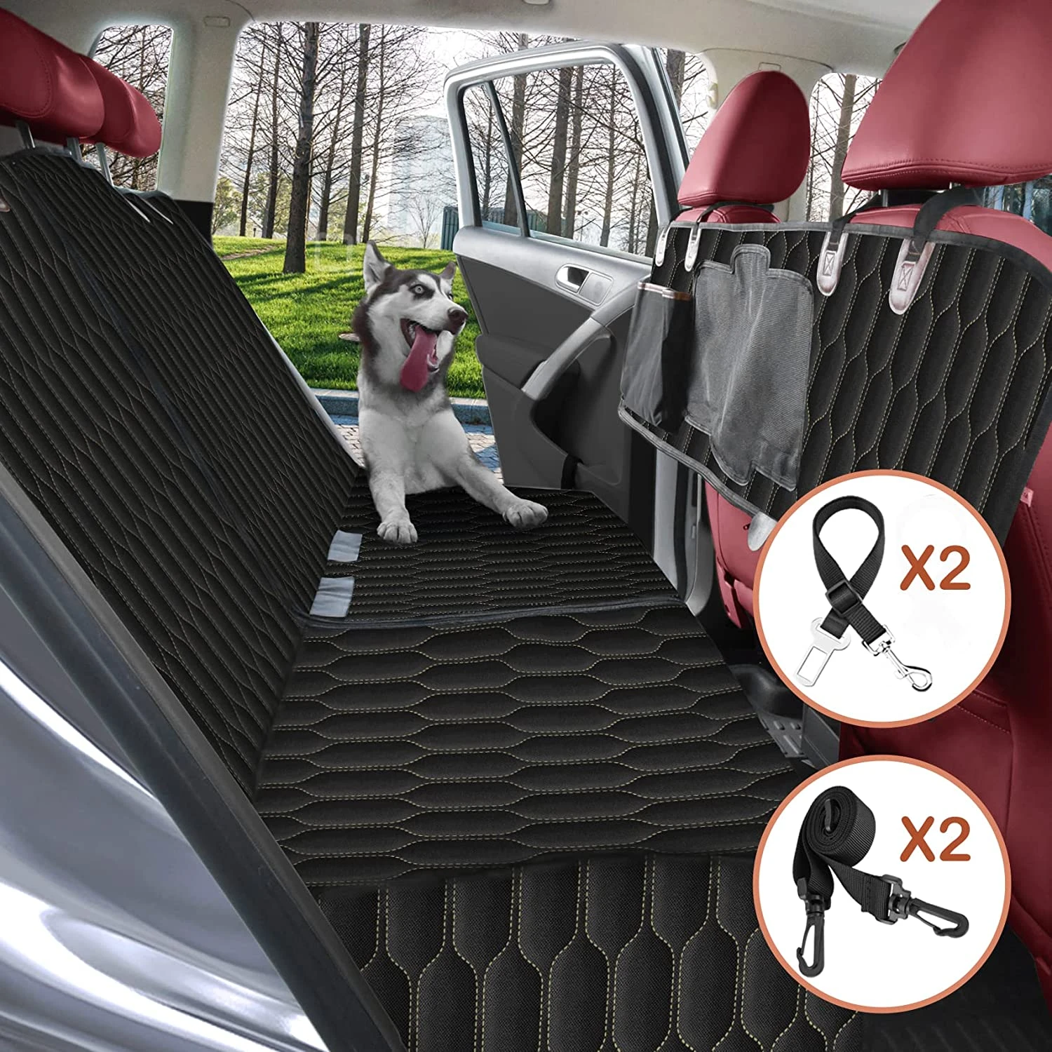 Make Safe During Car Rides: Rear pet seat cover come with 2 seat belts to control dogs can’t climb to the front seat. 4 heavy-duty headrest anchors and 2 seat anchors will make sure your car back seat cover is secured to his place. Non-slip bottom will make sure your pet will never slide around
