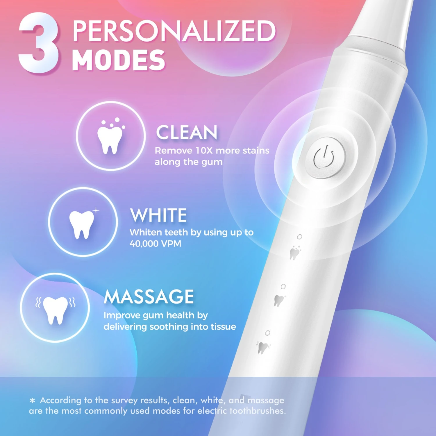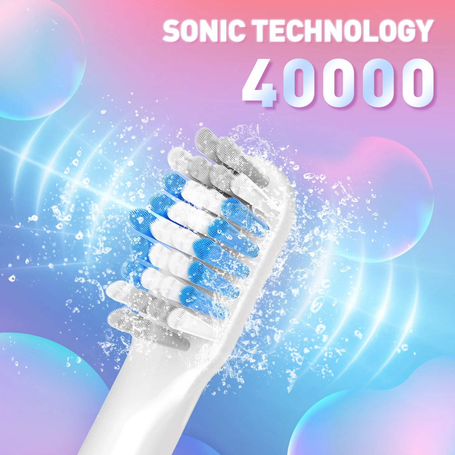 40000VPM HIGH VIBRATION – rechargeable sonic electric toothbrush equipped with World-leading Powered Motor to generate 40,000 STROKES per minute, and thus dissolve deep tooth dirt effectively. 10X Cleaning Effect than manual toothbrush and 3X than ordinary electric toothbrush.