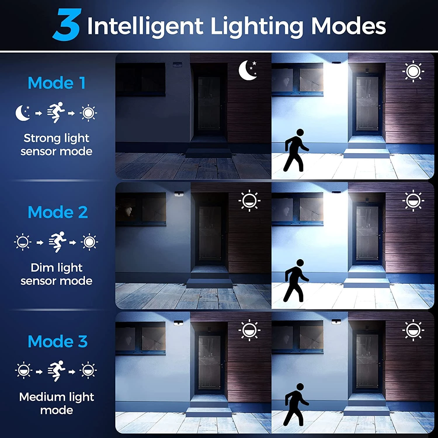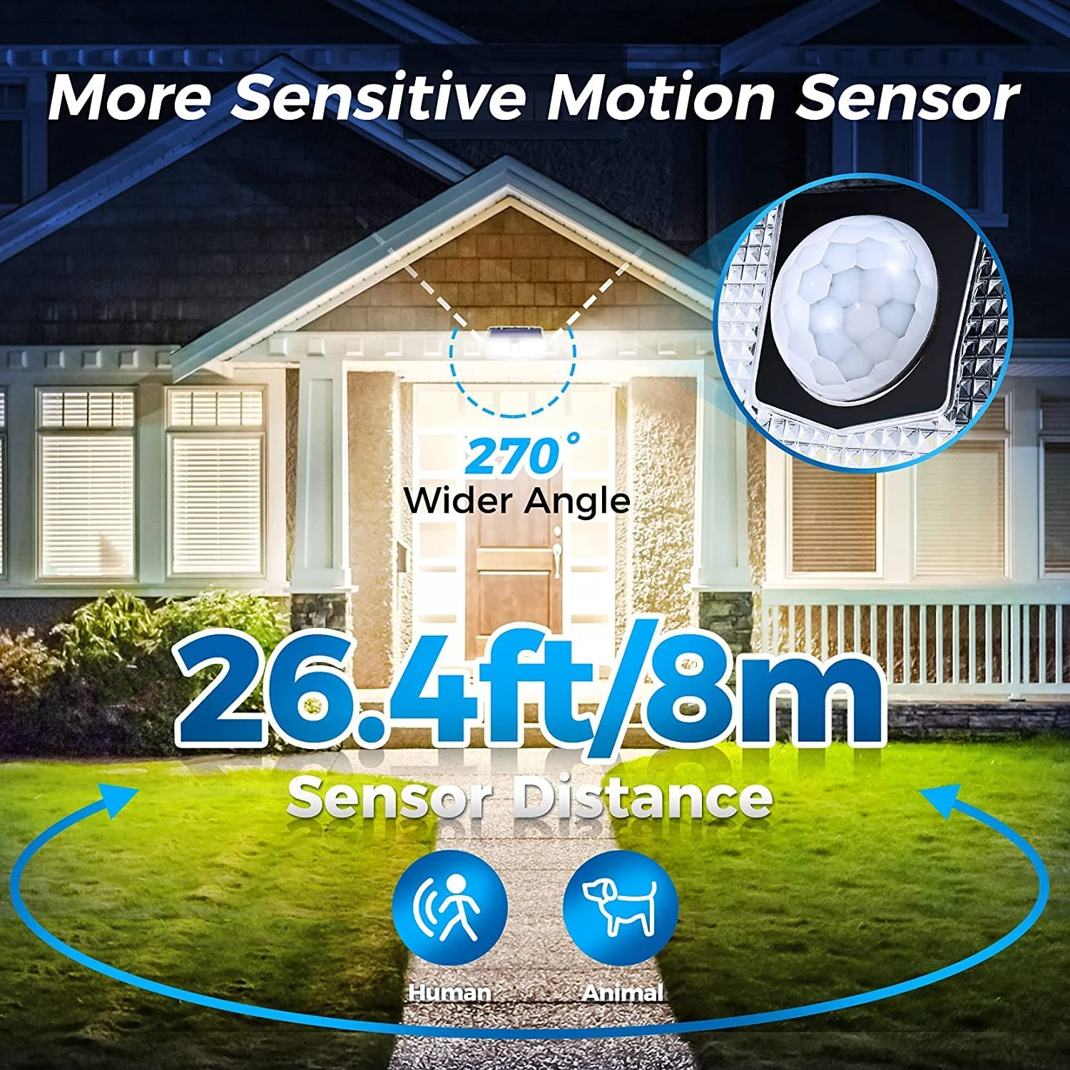 - 【3 Intelligent Lighting Modes】 The upgraded solar motion lights have 3 working mode to meet your different needs: ① Motion sensor mode;②Dim light mode; ③All night mediumlight mode. Sensitive PIR Motion Inductor provides powerful motion sensitivity up to 26 feet and 120°sensor angle.