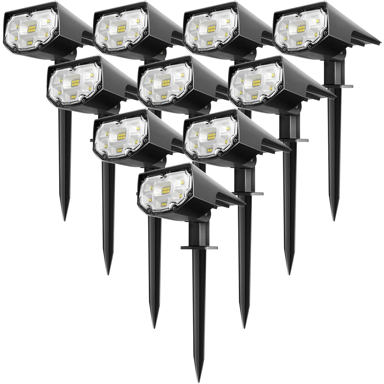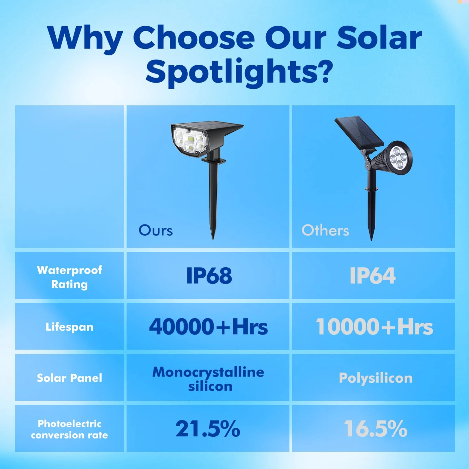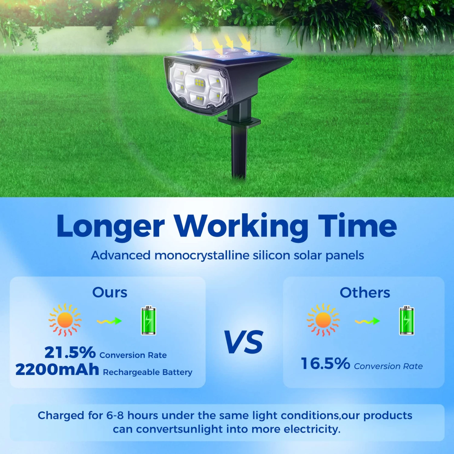 Cool White Light Solar Spotlights: Brighter 12 LEDs with Wider 120° Lighting Angle & 90° Adjustable Bigger Solar Panel & Longer Working Time with 18650 lithium rechargeable battery. solar landscape light is much more unique, fashionable and practical compared to other 4-6 LED lights in the market.