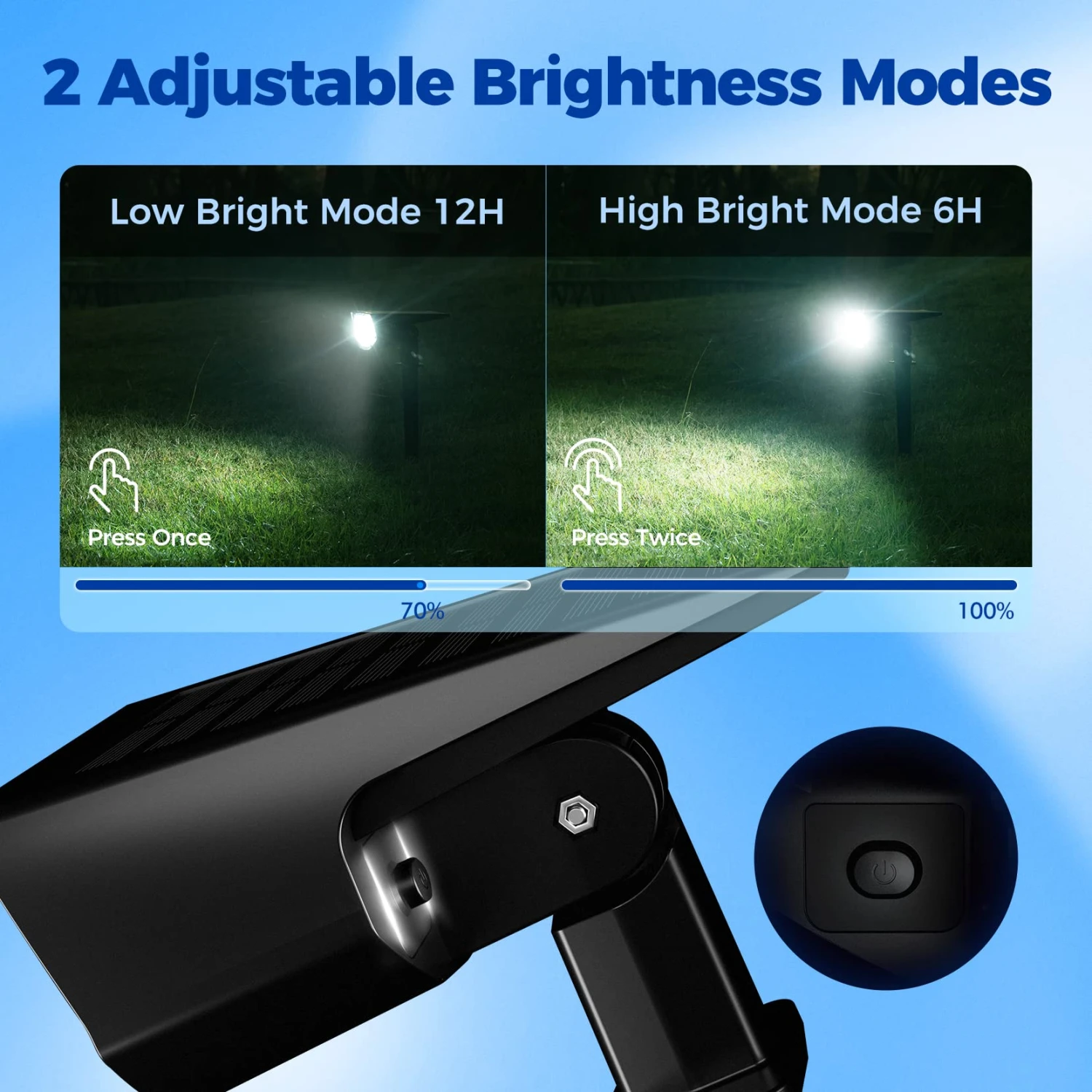 2 Brightness Lighting Modes(Always on): Low Light Mode(12hrs) / High Light Mode(6hrs). solar landscape spotlights can automatically detect changes in the brightness of the external environment. When the brightness is low enough to require illumination, it will automatically switch from energy storage mode to lighting mode without motion detection (Auto on at night / Auto off at sunrise).