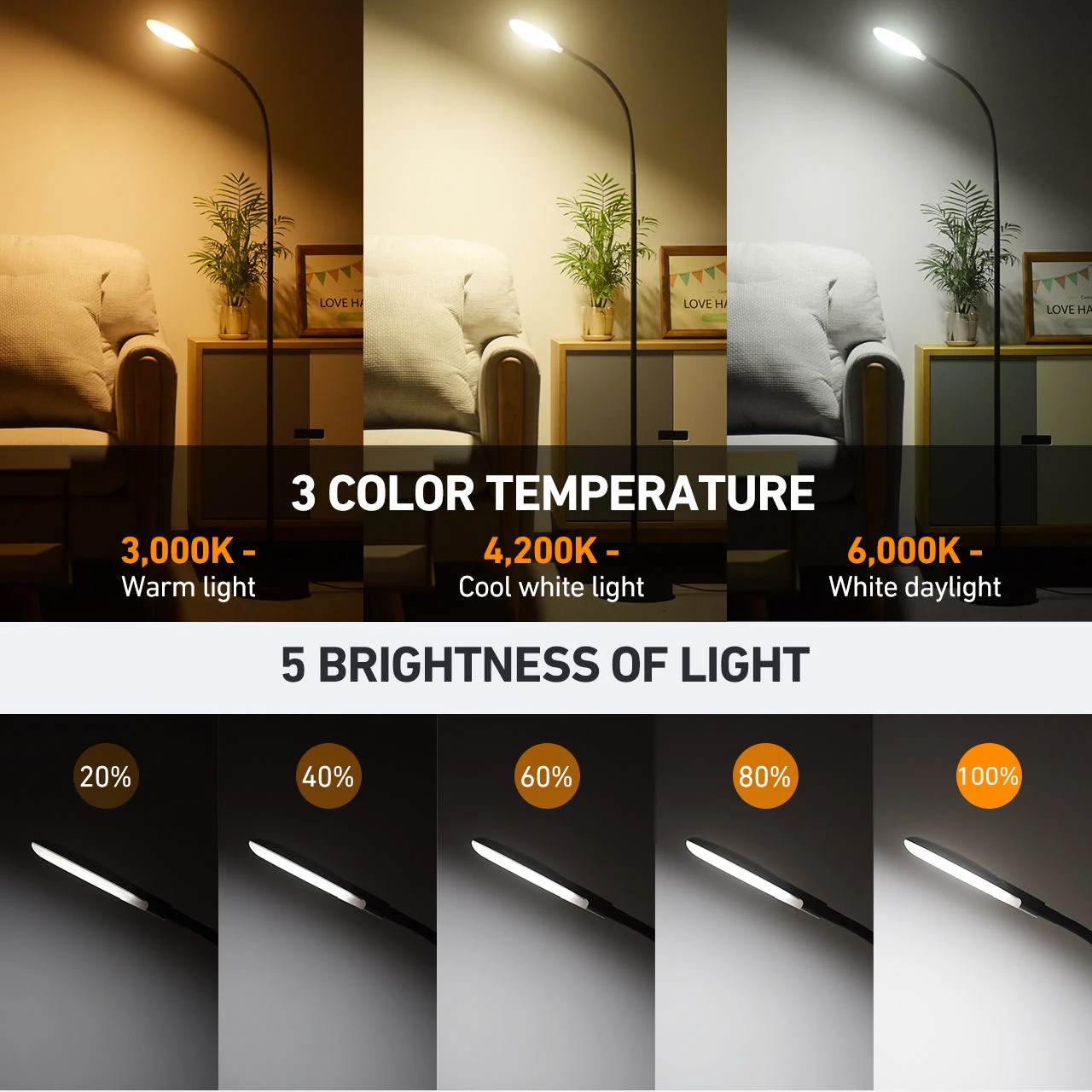 ¡¾360¡ãAdjustable Floor Lamp & Sturdy¡¿- Designed with a soft and flexible silicone gooseneck, the LED floor lamp is easy to bend and twist to any desired angle.Thanks to the built-in base stabilizer, the tall floor lamp will keep steady when you adjusting angle.This slim, minimalist LED floor light brings bright, adjustable lighting to your study, bedroom, living room, or office.