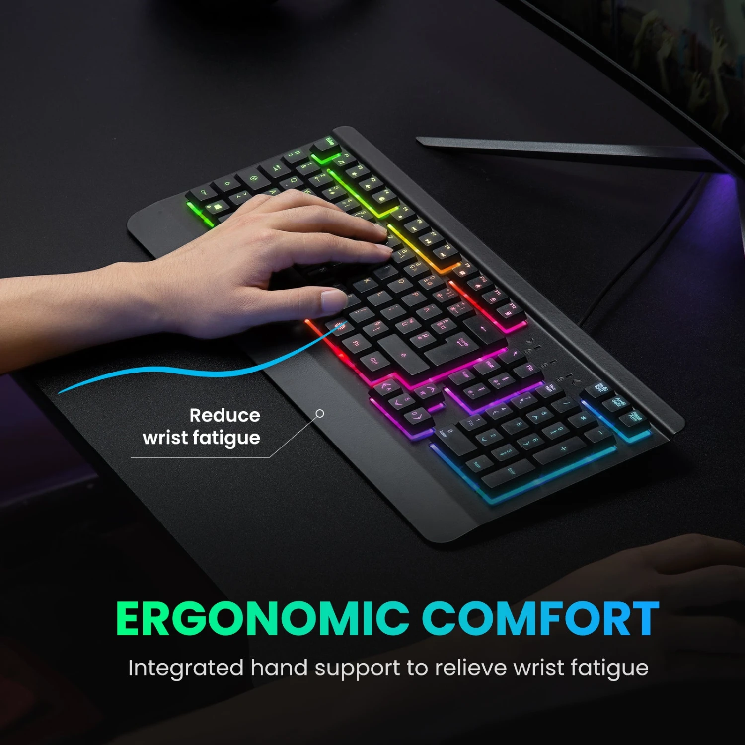 Crater Architecture for Best Tactile Feedback: 55g actuation force and 4.0mm travel distance provides 4X faster input speed, enhancing the great typing feedback. Crater structure also provides quiet keystrokes, the mute function will not cause trouble, disturb others, making this computer keyboard suitable for office and games.