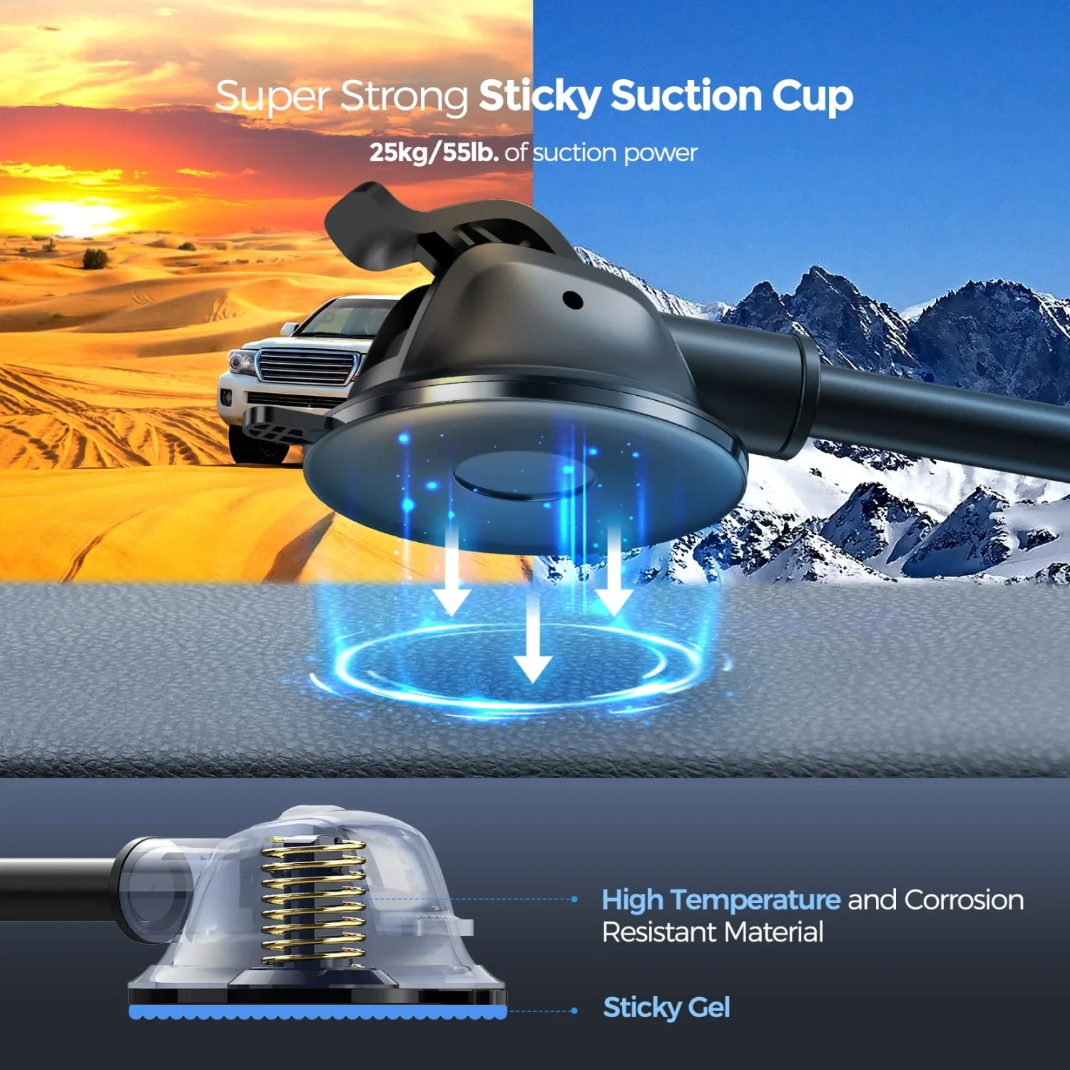 The super vacuum suction cup of this car phone holder mount with a sticky layer of gel, can maximize the stability of the suction cup, keep the lock summary on the suction cup in the raised state before installation, and press the lock summary after installation, If the suction cup is dirty or loses stickiness, just wash it with water to restore stickiness