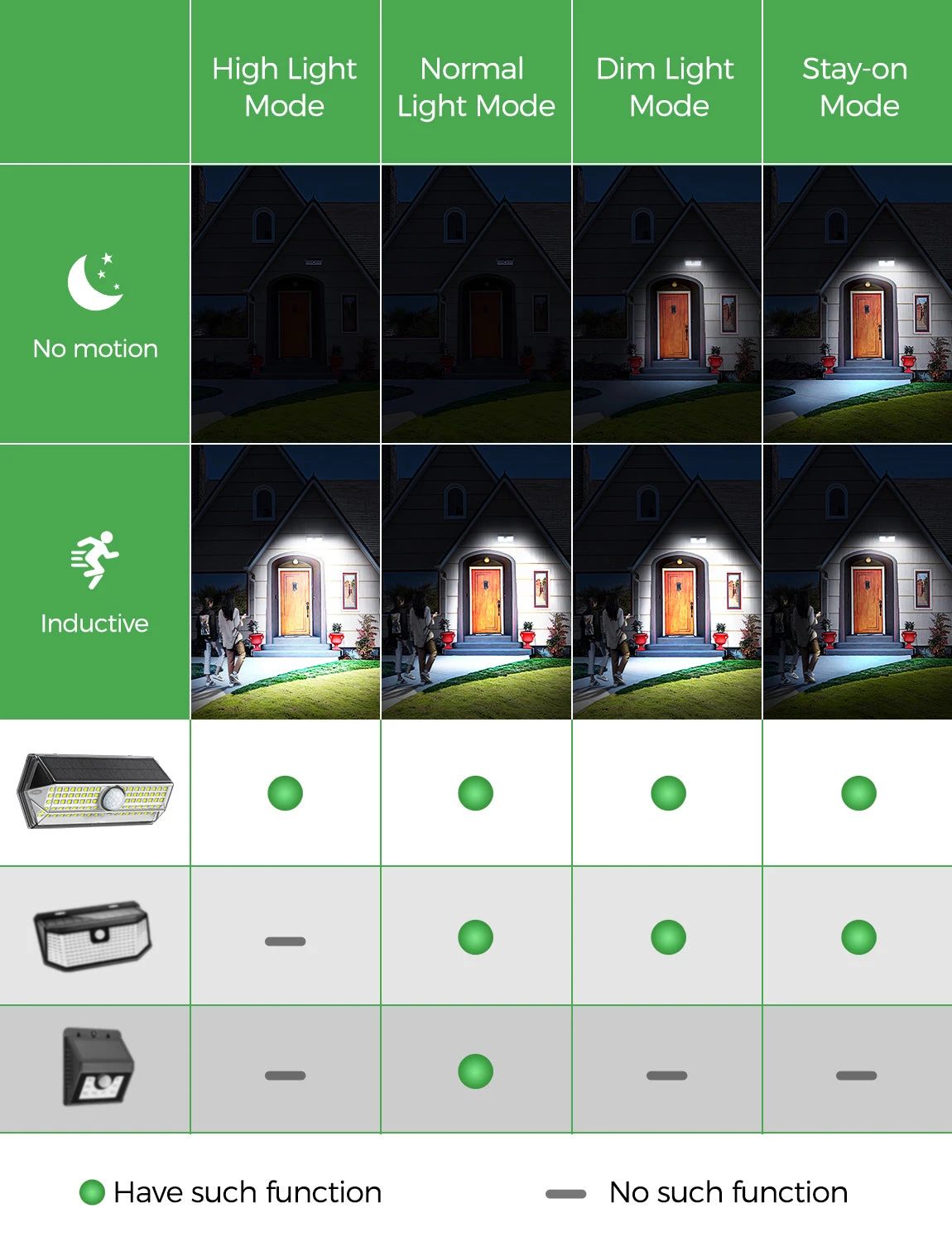 【4 Optional Modes】 1.Smart Security Mode (when it detects motion at night. Motion sensor turns the light on full high brightness for 20 seconds and off automatically) 2.Nomal Light Mode(Motion sensor turns the light on medium brightness) 3.Dim light sensor mode(Auto come up with dim lighting at dark and turns into full brightness when motion detected) 4. Permanent On mode(Auto turns on at night and stay all night with medium brightness).