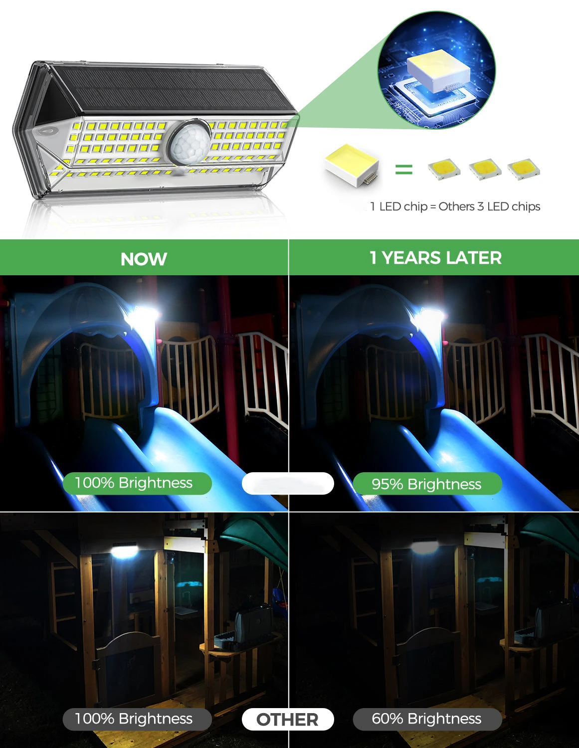 【Super Bright Solar Light & Save Your Money】Designed with big size LED chips, which can reduce lighting loss. And equipped with durable transparent lampshade enhances light transmittance to increase brightness, new version led solar lights outdoor is bright enough than most 100/120/140 led solar lights and more energy-saving, it can light up your backyard and pathway with no electricity bill.