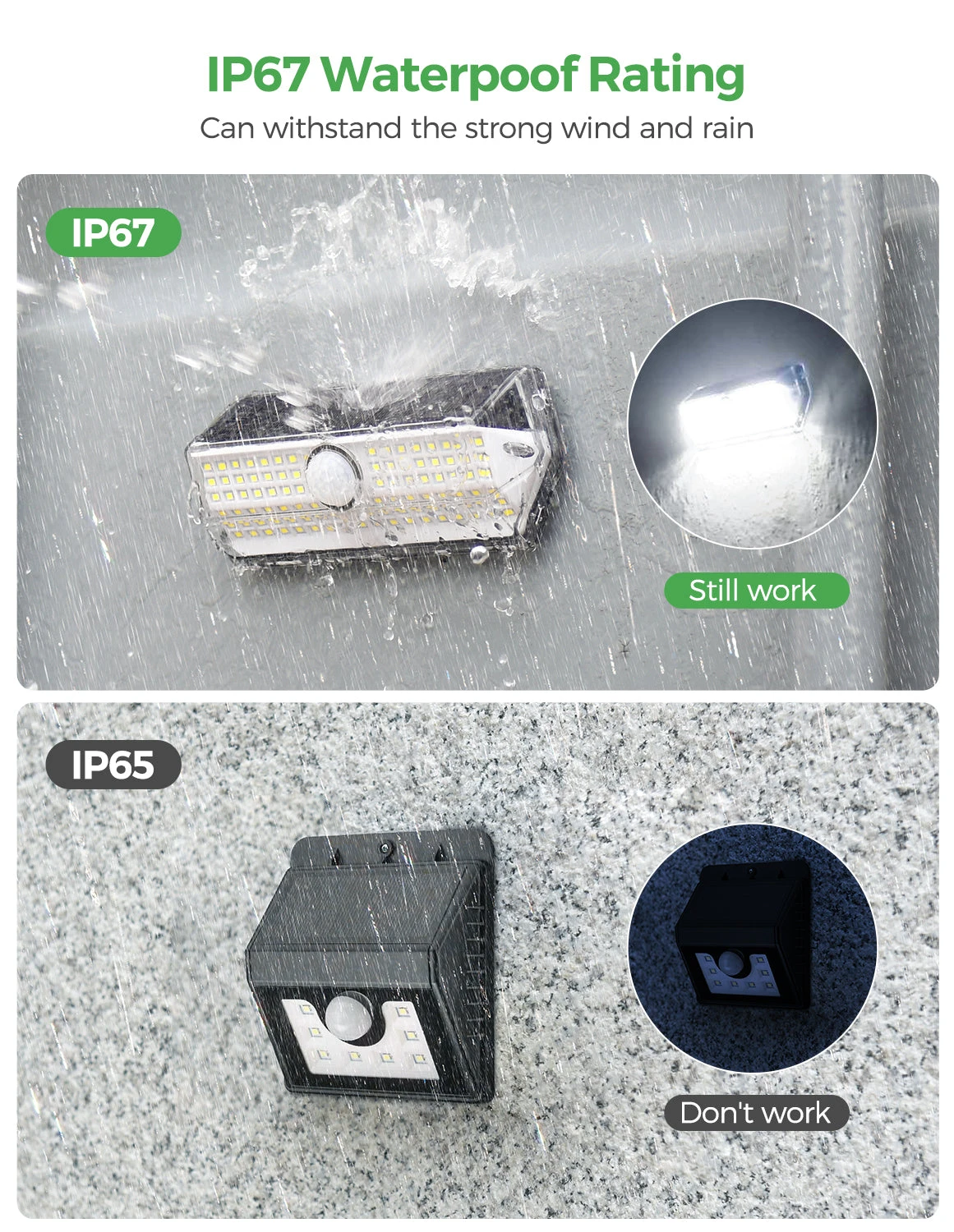 【Efficient Solar Charging & All Weather Resistance】Designed with monocrystalline solar panels, the solar conversion rate has been improved from common 16.5% to 20.5%. Made of high-impact ABS material and waterproof design, solar motion sensor light outdoor reaches IP67 waterproof level. It is perfect for withstand extremely terrible weather. Whether it’s a rainy day, hot day, freezing day, no need to worry about your solar lights outdoor.