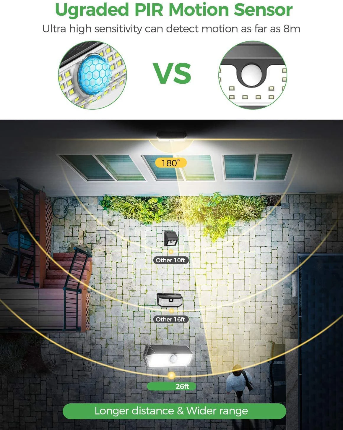【Accurate PIR Solar Motion Light】 Built-in a sensitive light sensor and PIR motion sensor (sensing distance up to 26.4FT/8M and 120°sensing angle), the solar motion sensor Light can pick up movement from a small dog/cat easily, but will not be triggered by raindrops, leaves, etc. After detection, the solar security lights will light up a large scale of space with gradual illumination and will not scare your pets or guests