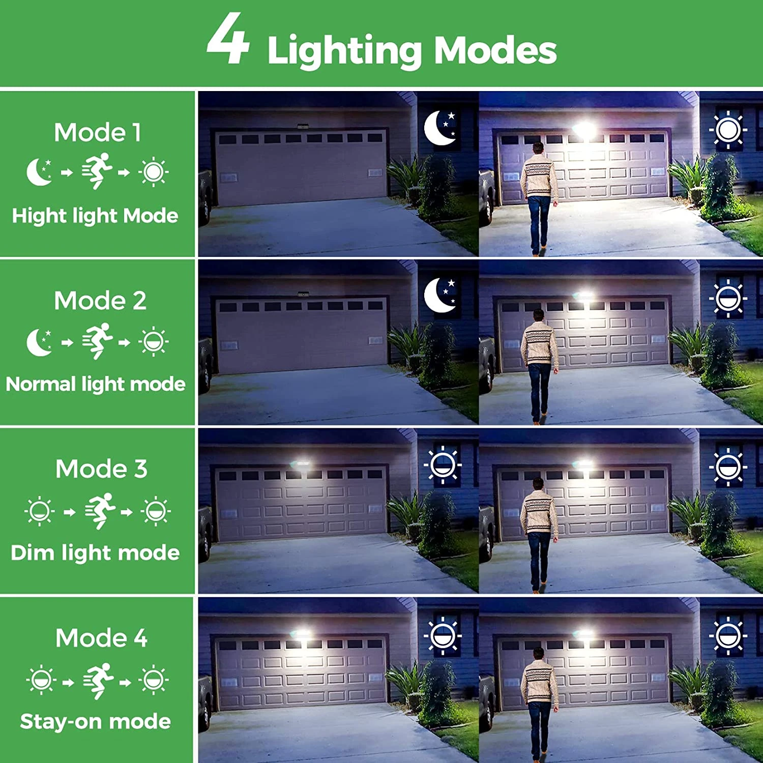 【4 Optional Modes】 1.Smart Security Mode (when it detects motion at night. Motion sensor turns the light on full high brightness for 20 seconds and off automatically) 2.Nomal Light Mode(Motion sensor turns the light on medium brightness) 3.Dim light sensor mode(Auto come up with dim lighting at dark and turns into full brightness when motion detected) 4. Permanent On mode(Auto turns on at night and stay all night with medium brightness)