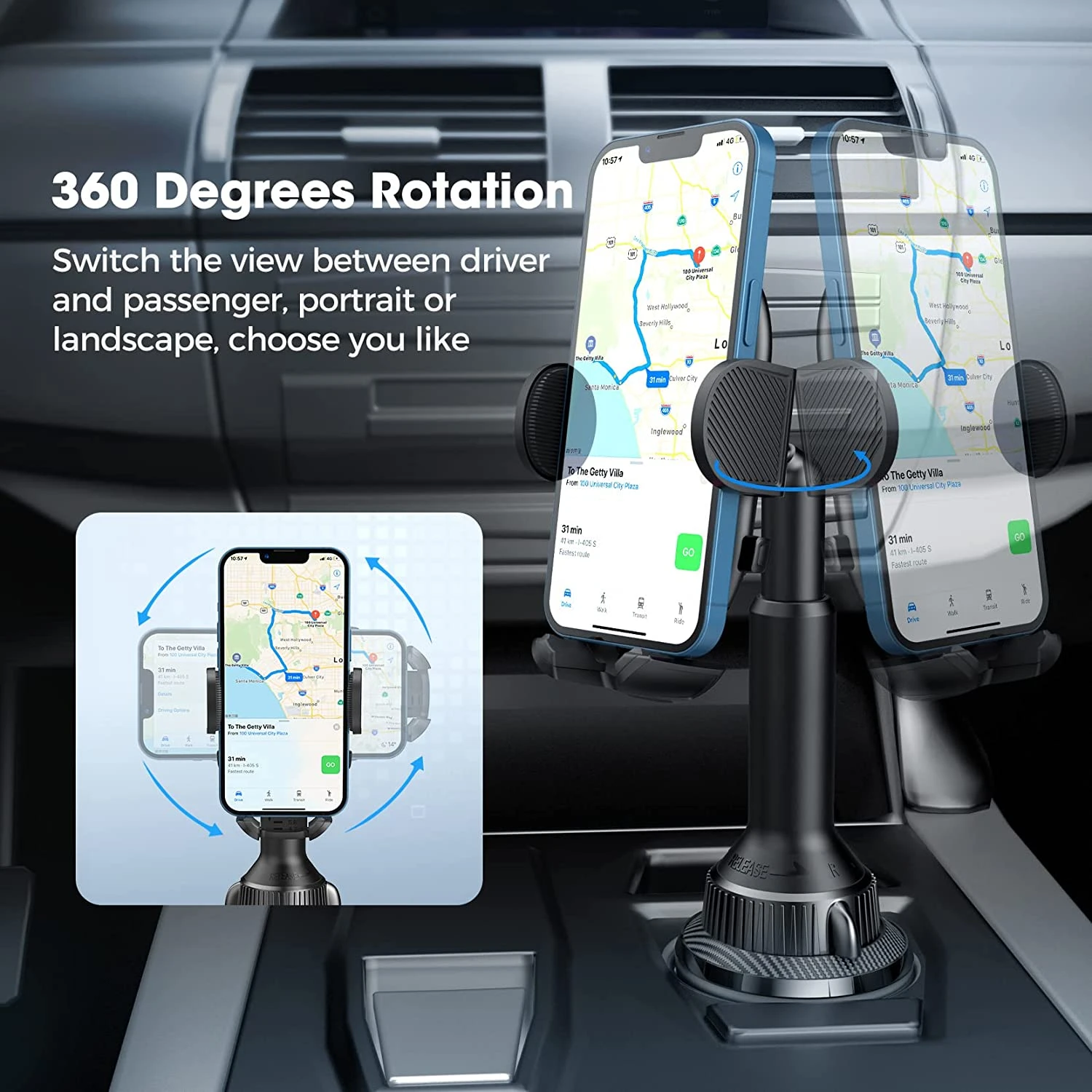 - 【UNIVERSAL EXTENDABLE CUP BASE】: The base of this cup holder phone mount can be extended from 3 inches to 4.6 inches, suitable for 99% of car cup holders, the base adopts a ergonomic design, the vertical stripe design and two raised blades make it easy to rotate the base, at the same time, we have attached three rubber pads to the base to better fit the car cup