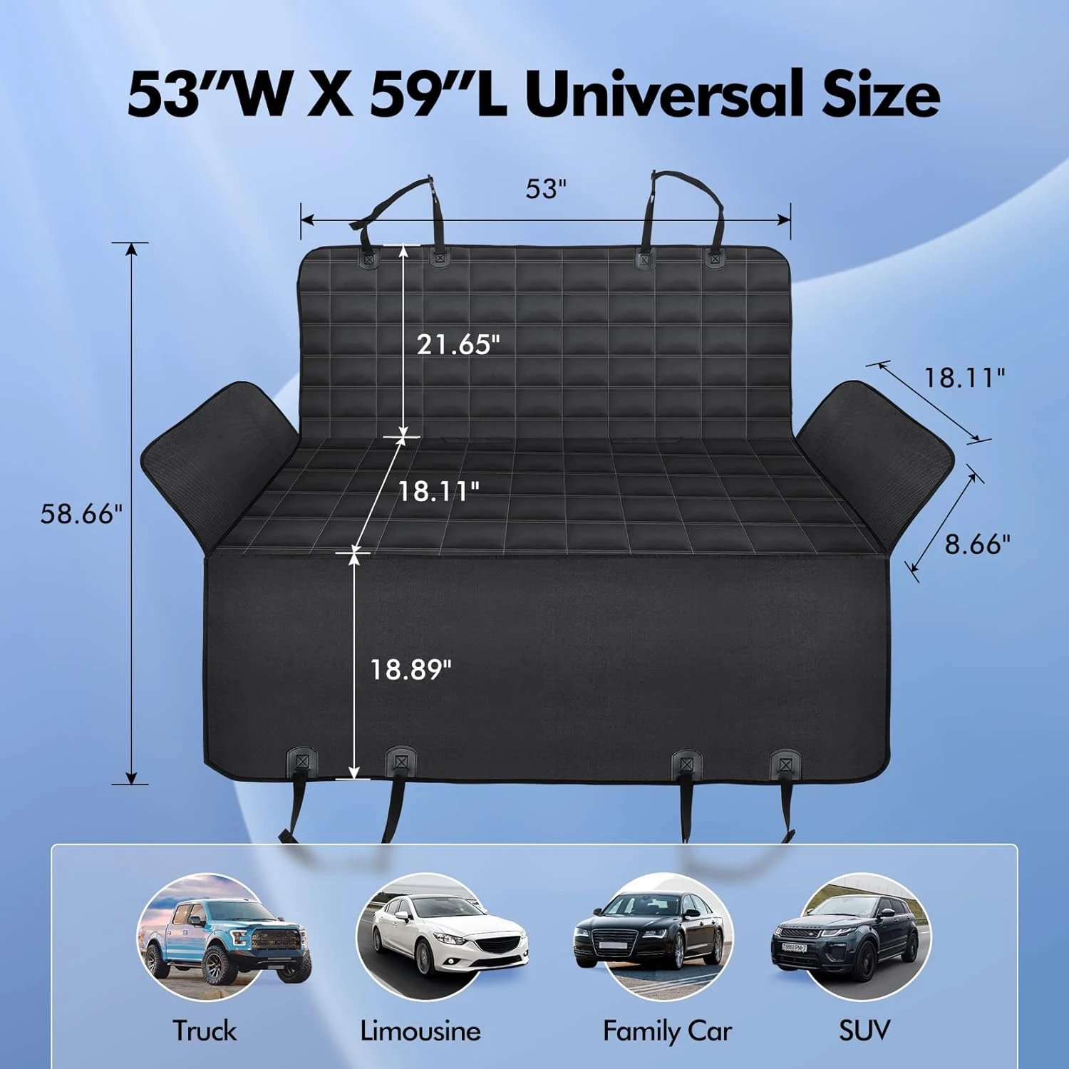 - 4 𝐈𝐍1 𝐌𝐔𝐋𝐓𝐈𝐅𝐔𝐍𝐂𝐓𝐈𝐎𝐍𝐀𝐋 𝐃𝐎𝐆 𝐒𝐄𝐀𝐓 𝐂𝐎𝐕𝐄𝐑, 𝐔𝐍𝐈𝐕𝐄𝐑𝐒𝐀𝐋 𝐒𝐈𝐙𝐄 𝐅𝐎𝐑 𝐌𝐎𝐒𝐓 𝐂𝐀𝐑𝐒: Our car seat protector for dogs is a versatile accessory that functions as a ①dog car hammock, ②bench car seat cover, ③trunk cargo liner, ④camping mat. It covers the entire car back seat for ultimate protection, ensuring hassle-free rides and worry-free family excursions. With our dog car seat cover, you can enjoy the company of your furry friend without damaging your car.