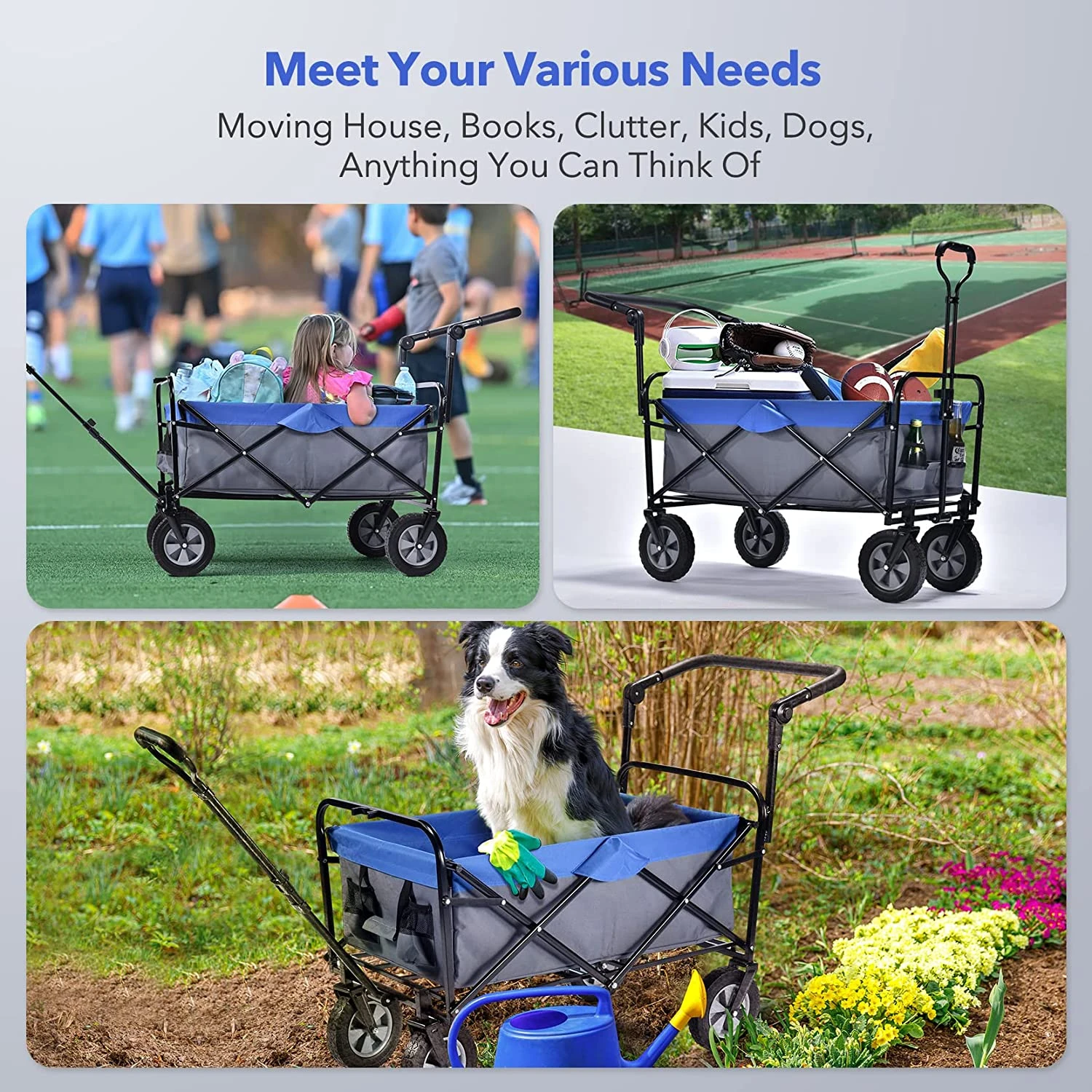 - 【Adjustable Front and Rear Double Handles】: Different from other products on the market, our Folding Wagon has two adjustable handles on the front and back, you can choose to pull, or you can choose to push, The push handle can be set at any angle, and push the push wagon lightly to assist move the folding wagon easily when heavy loaded.
