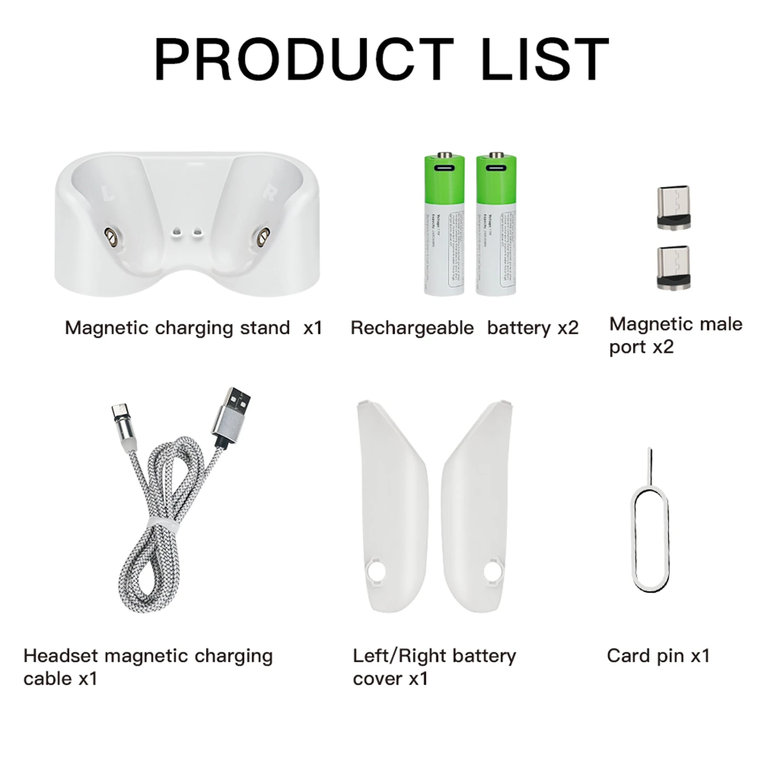 Package Included: Magnetic charging stand*1, Rechargeable battery*2, Magnetic male port*2, Headset magnetic charging cable*1, Left battery cover*1,Right battery cover*1, manual*1, Card pin*1
