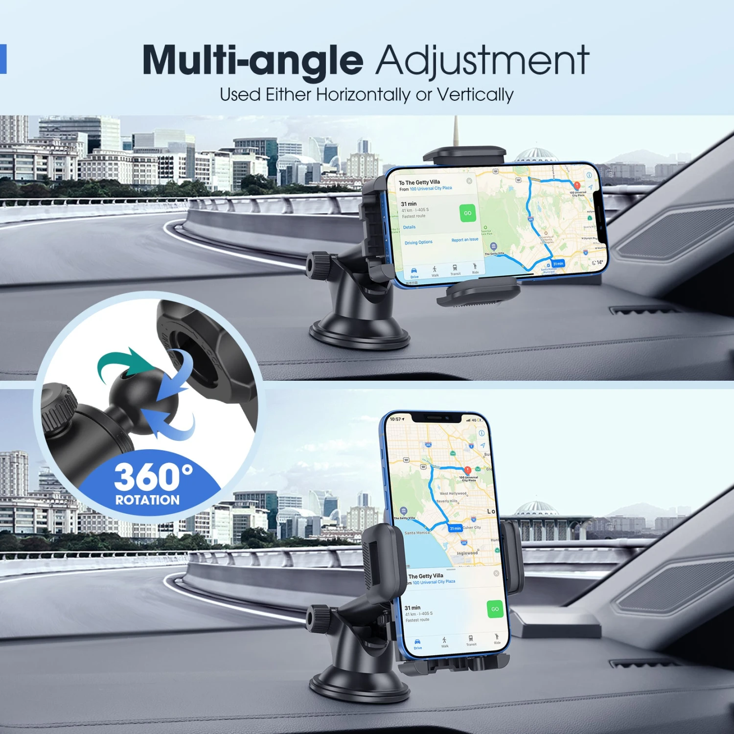 Ultimate Angle Adjustment: The dashboard/windshield phone mount features a telescopic arm that can extend from 4.6in./11.8cm to 6.6in./16.8cm for optimal length in vehicles of all sizes. For added convenience, the arm also pivots 270¡ã to reach your desired viewing angle. The 360¡ã pivot joint lets you view your phone at any comfortable angle, portrait or landscape orientation.