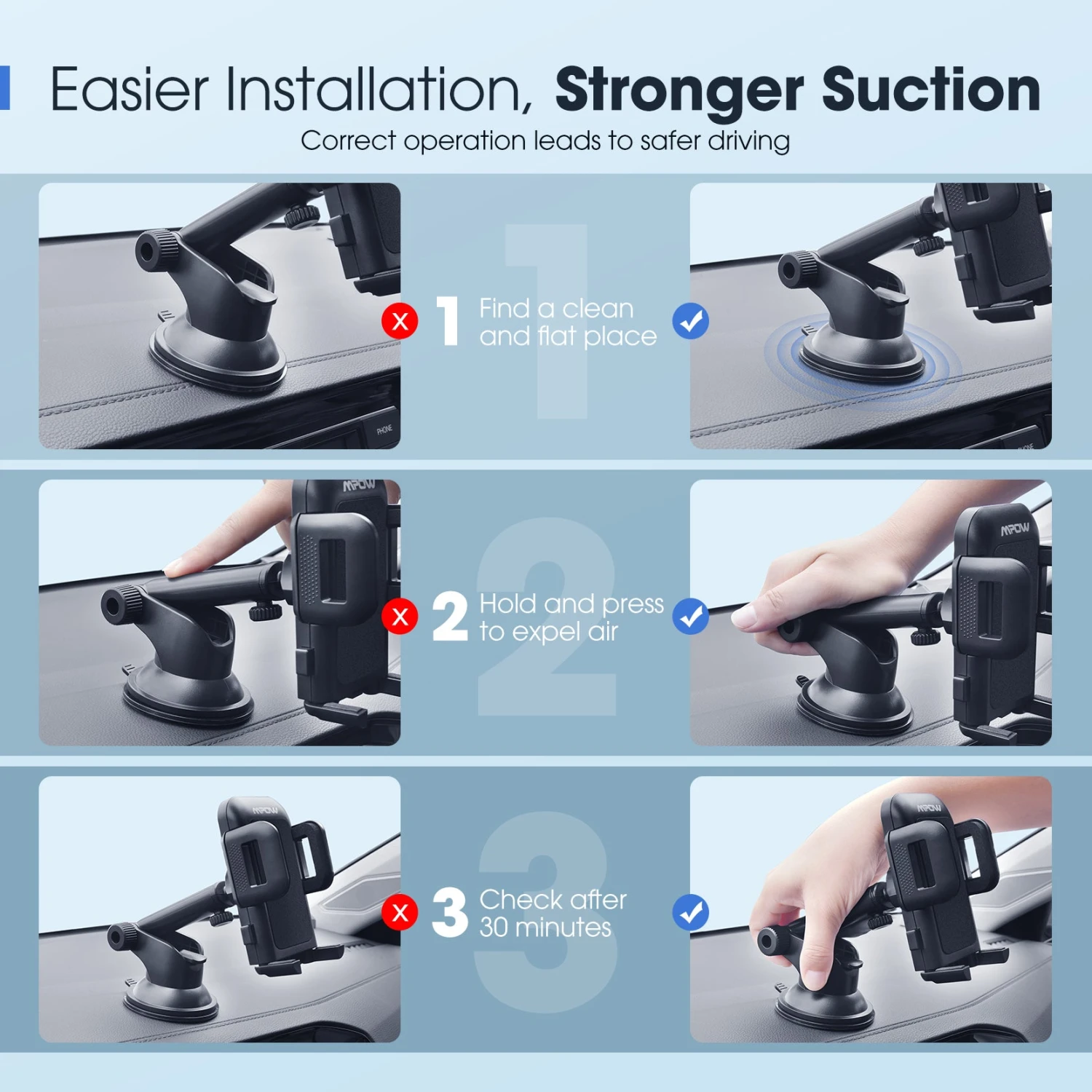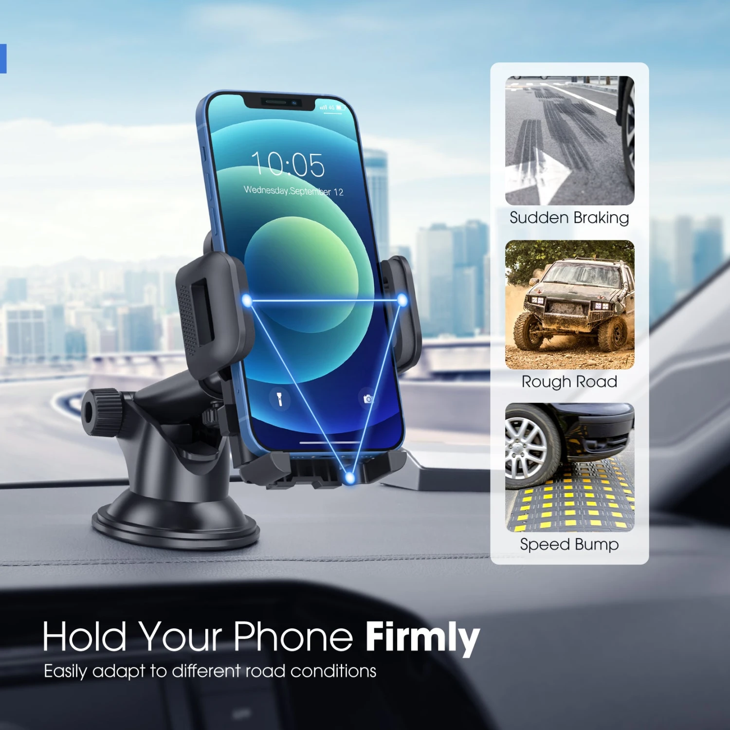 All-round Protection: There are sponge pads on the surface, side arms and bottom feet of your dashboard/windshield phone holder, which will dampen vibration from road shock, and protect your device from falling and scratching against the mount. The cushioned car phone mount holds your phone in place regardless of road conditions.