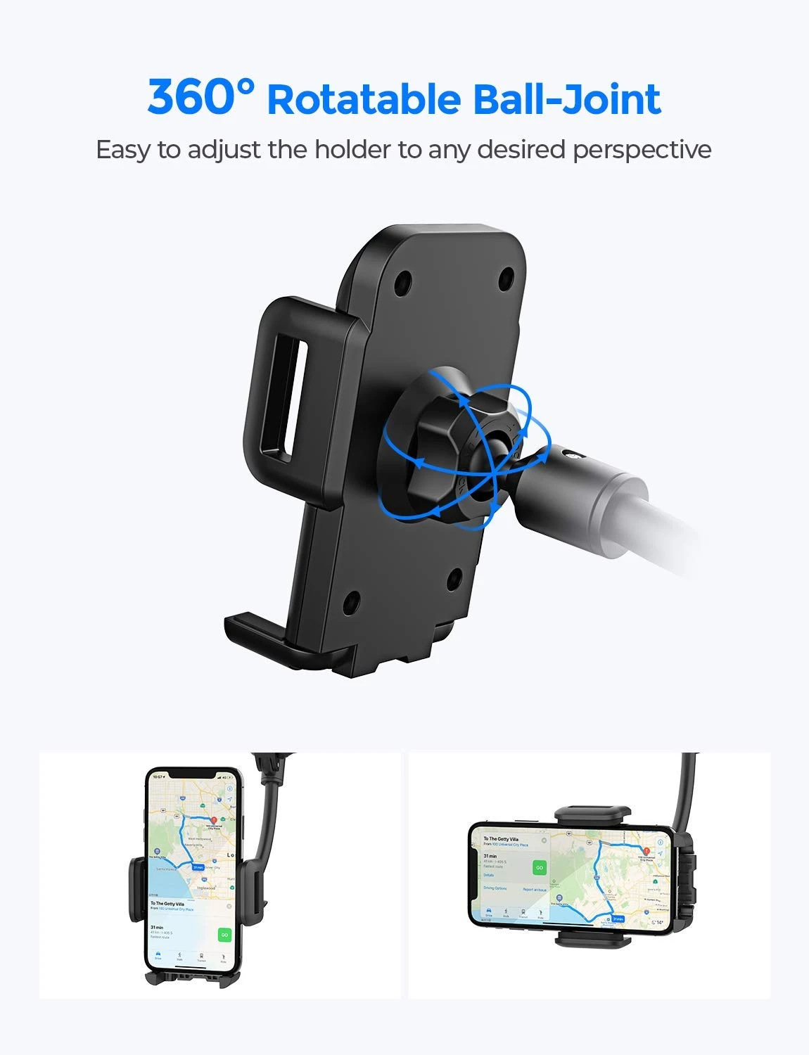 - [Optimal Viewing] : The cell phone car mount can be adjusted to every viewing angle as you want by rotating 360ยฐ flexible ball head and bending the goose-neck arm. High-quality aluminum thicker long arm ensures durability and makes the device closer to your sight.