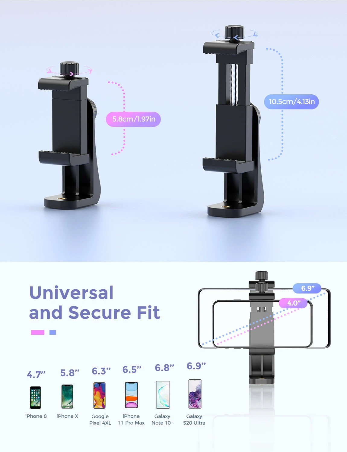 【ADJUSTABLE PHONE HOLDER】The phone clip is non-slip and the size can be adjusted from 2,2 inches to 3,7 inches it holds most smartphones with screens up to 6 8″ Widely compatible with iPhone 13/12/11/11 Pro Max/Xs/XR/Xs Max/X/8 Plus/Galaxy Note 10/9/S20/S20+/S20 Ultra/S10/S9/S9 Plus/S8/S7 Note and other Android Phones etc. Also compatible with GoPro and cameras Mini Projector as 1/4″ screw can be connected to the pan-and-tilt.