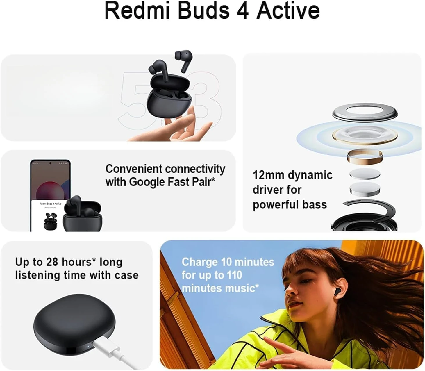 Xiaomi Redmi Buds 4 Active, Advanced Bluetooth® 5.3, 12mm Dynamic Driver, Google Fast Pair, Up to 28 Hours* Long Listening time with case