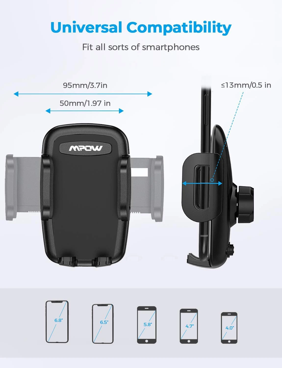 Adaptable to most phone sizes: the phone holder expands up to 95mm/3. 7in wide, holds most phones with screen sizes between 4. 7’’ and 6. 8’’, including iPhone XS Max/XR/XS/X/8 Plus/8/7 Plus/7/6 Plus/6/6S Plus/6S; Galaxy S10/S10 Plus/ S9 Plus/S9/Note 9/Note 8/S8/S7/S7 edge/S6 Plus/S6; Pixel/Pixel 3 XL/3/2XL/2/XL; LG; blu; Xiaomi; Moto and more. Tips: supports phone case thickness up to 13 mm/ 0. 5 inches.
