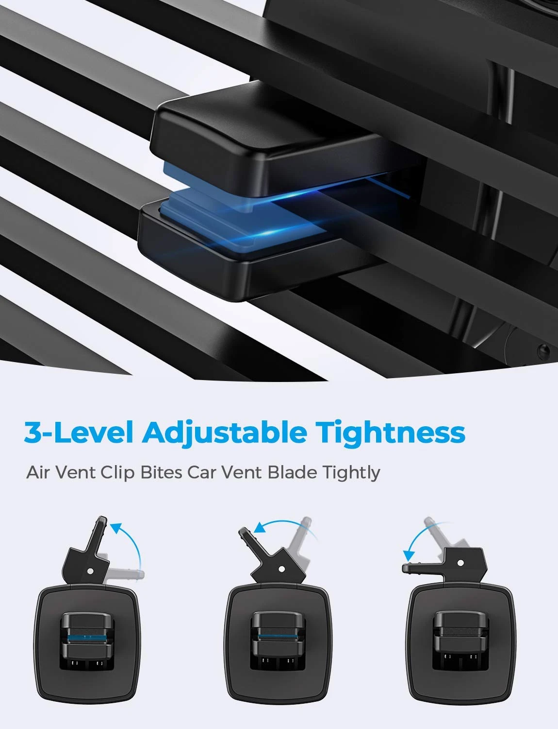 3-Level adjustable vent clip: the spring-loaded vent clip is equipped with an adjusting lever, providing you with 3 different tightness. 1st level: 2. 5 – 3. 5mm; 2nd level: 1. 8 – 2. 5mm; 3rd level: <1. 8mm, Fits most vertical or horizontal vent louvers. At the same time, you can better insert and remove the phone holder from the vent by adjusting the Gear.
