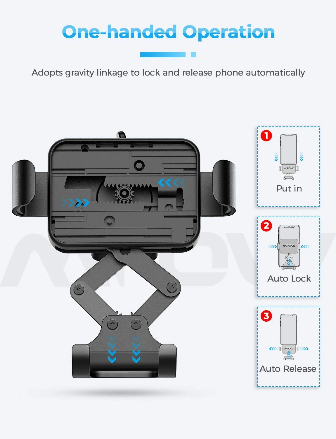 How gravity car phone mount works user-friendly gravity linkage design enables the arms of Mpow car phone holder to lock or release automatically by the weight of your phone Hold your phone in the easiest way.