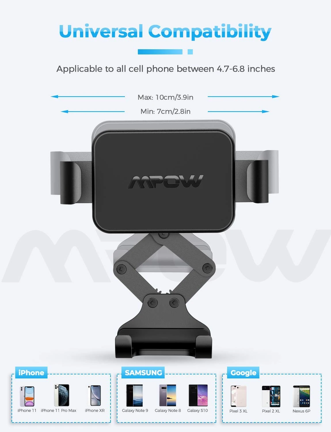 Extensive Compatibility MPOW gravity air vents phone holder supports phones of size 4 7-6 8″ compatible with most phones including iPhone 11 Pro Max XR XS X 8/7/6 Plus Samsung Galaxy S10 / S10+ / S10e / Note 9 / S9 / S9+ / S8 / S8+ / Note 8 S7 S6 S5 S4 LG Nexus Pixel Sony Nokia and more.