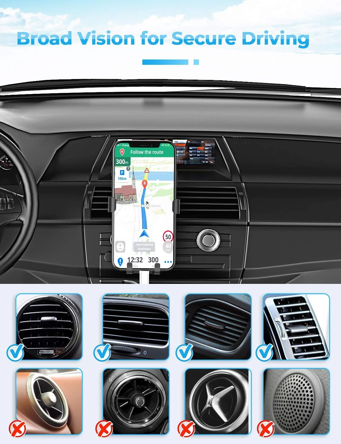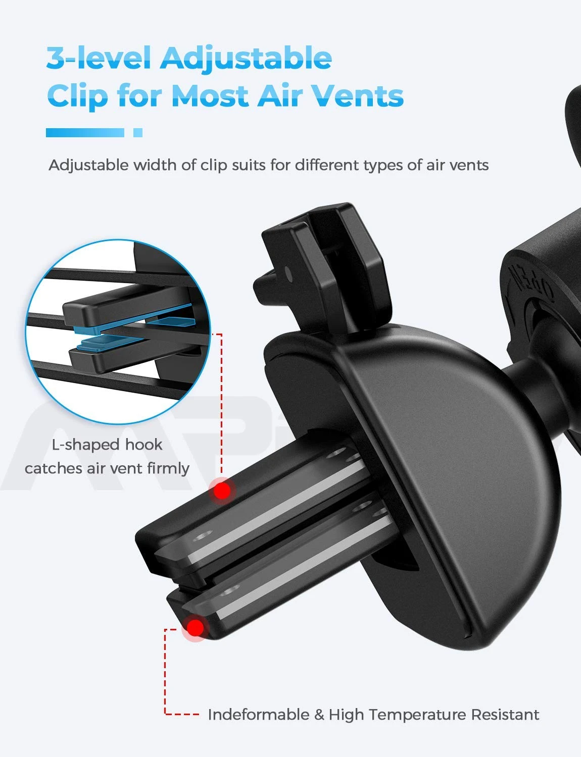 The upgraded Air vent clip Silicone-covered Air vent clip With adjustable 3-level lever optimized the ways of installation The tightness of the clip can be readjusted depending on the width of air vent blades avoiding Damage or scratch The Air vent clip builds in manganese steel featuring a high hardness that can be used repeatedly Covered with high-temperature resistant PC material makes car phone mount more durable.