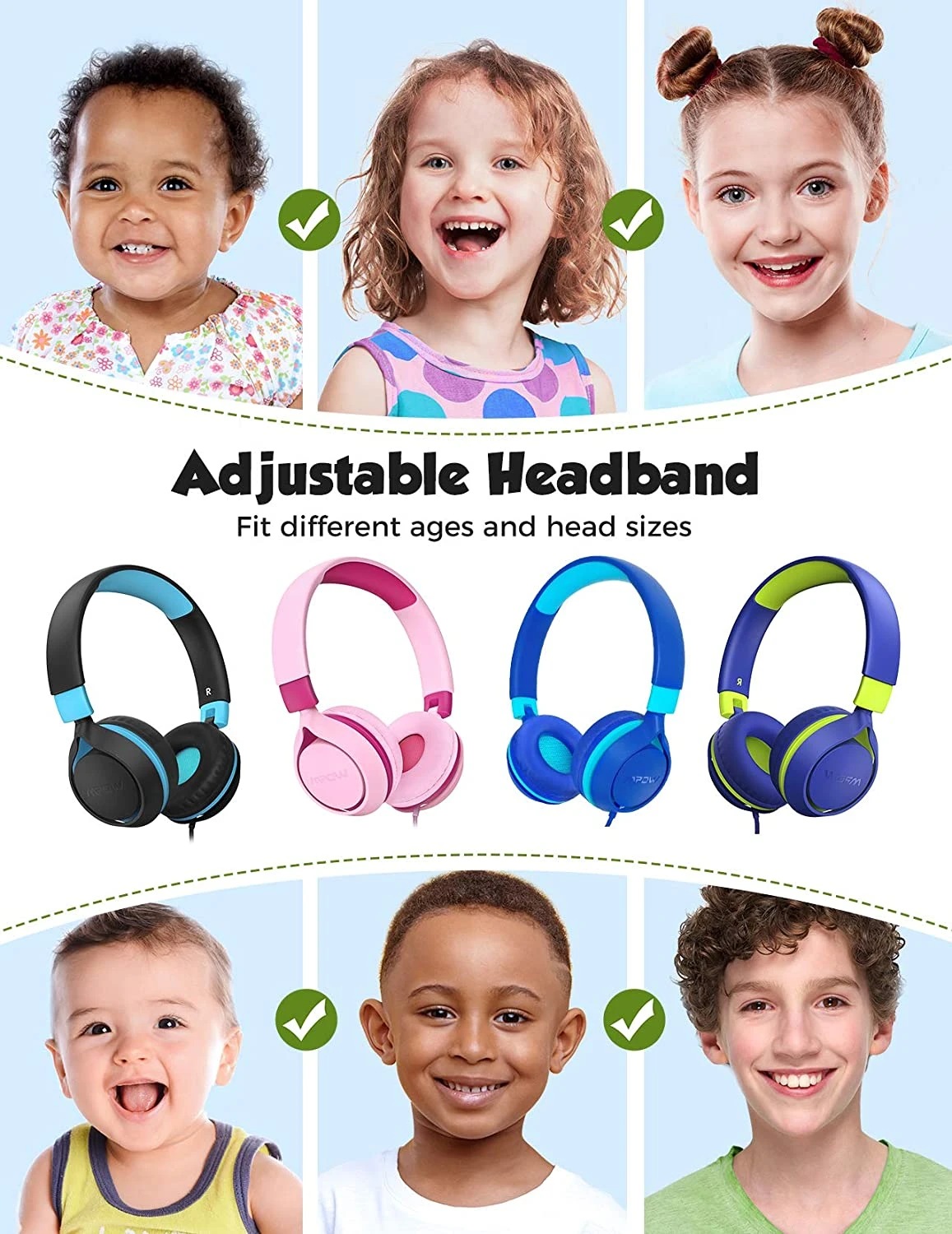 Comfort & Adjustable: Ultra-soft padded head beam and plushy foam earmuffs with 90°swiveling design ensure maximum burden-free comfort and minimum clamping force; 2.8in/7cm retractable headband offers the perfect fit for all kids aged from 2-16 with different head sizes.