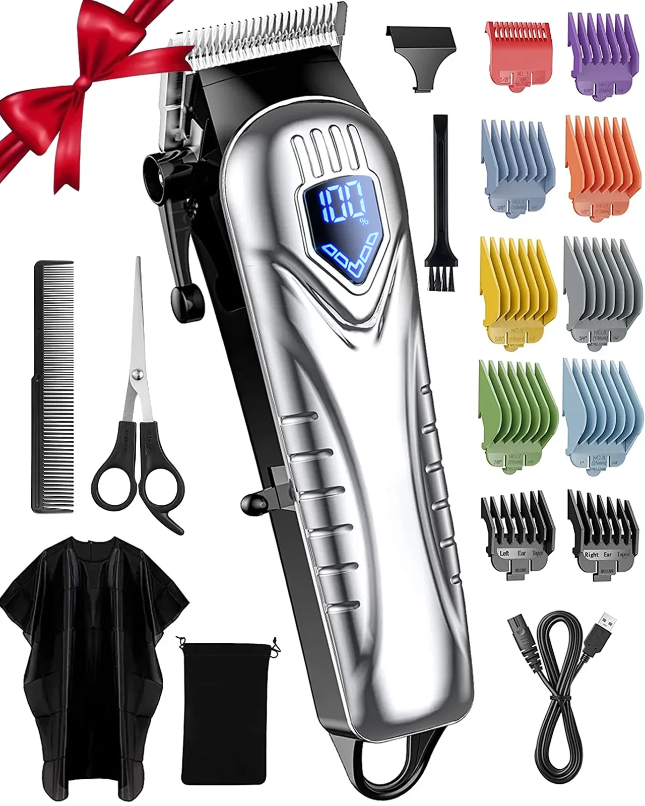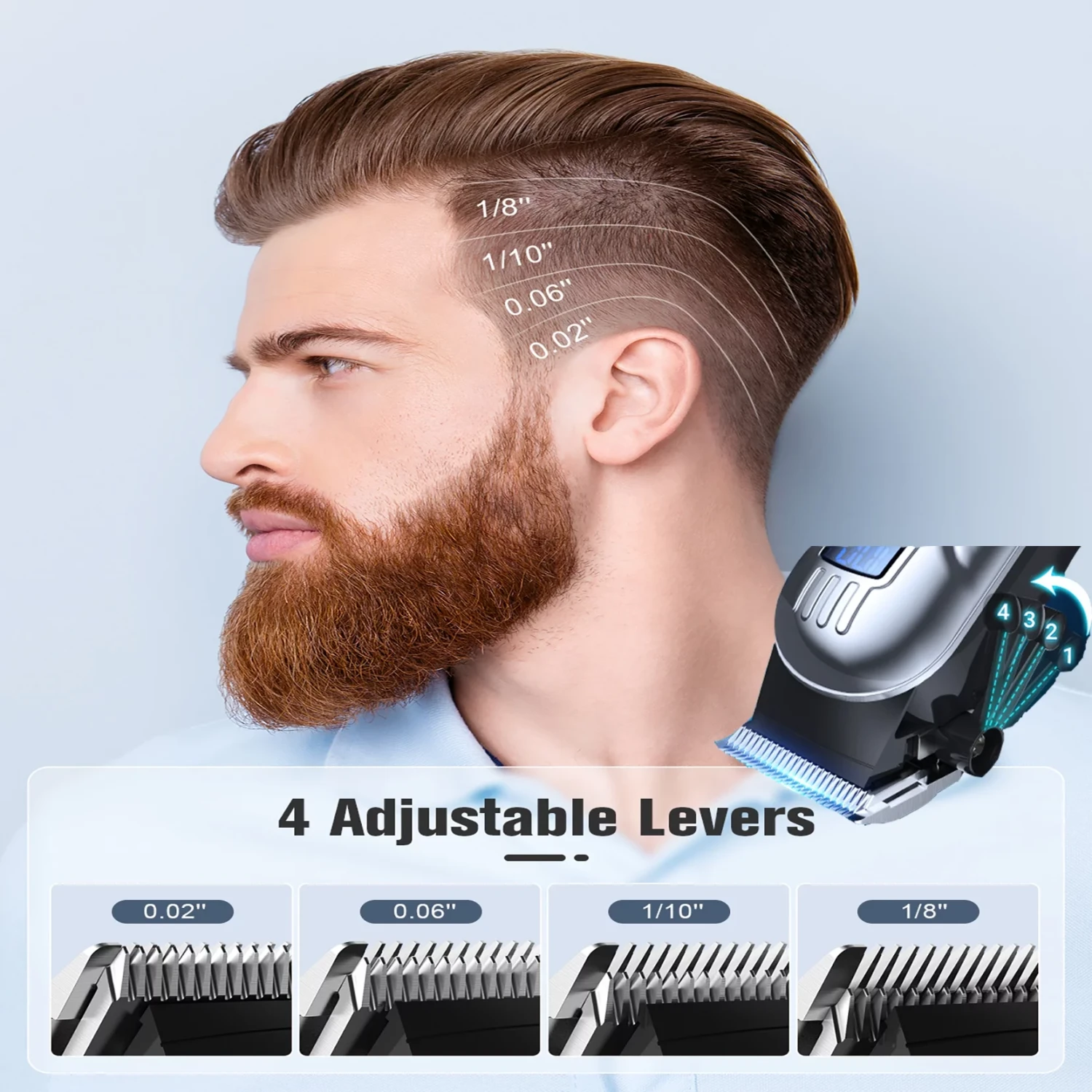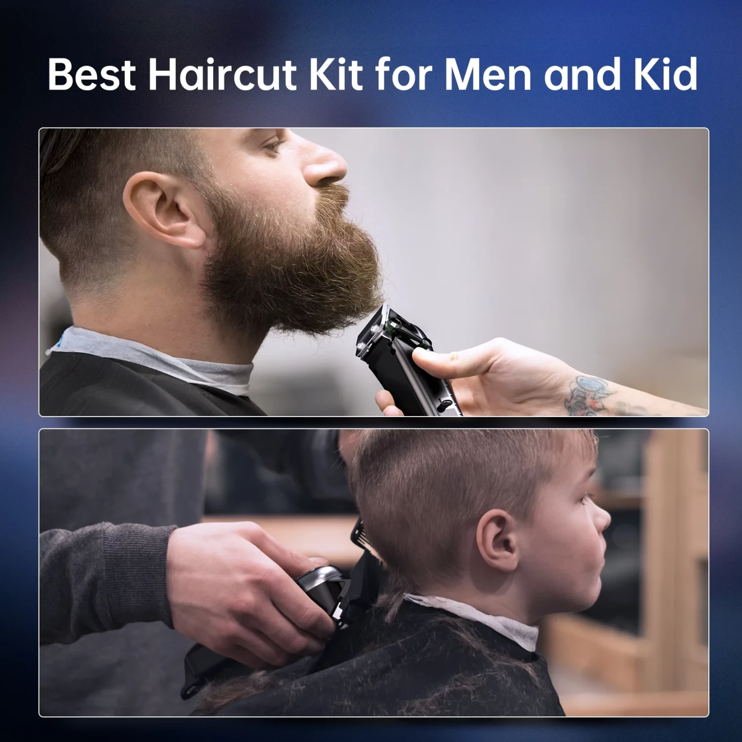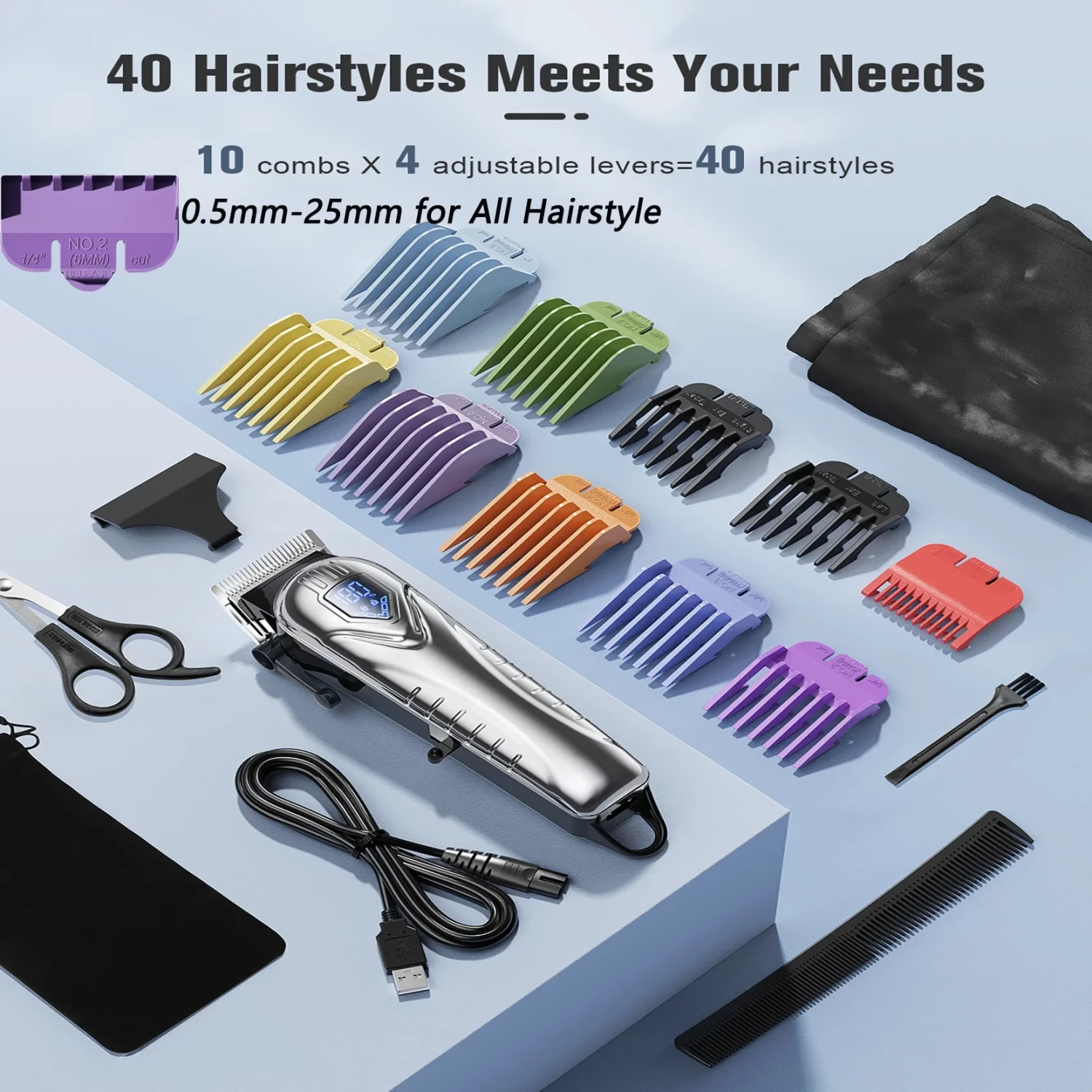 - A Complete Hair Clippers Kit of Men with 18 Pieces, Easily Get Any Haircut You Want – Professional complete haircutting kit with all the tools you need, the professional hair cutting kit includes 10 guide combs(0.5mm-25mm, left, right), 4 length adjustable taper lever (1/64”-1”) to create 40 hairstyle, plus scissor, cape(under the withe box), storage bag, cleaning brush and a comb.
