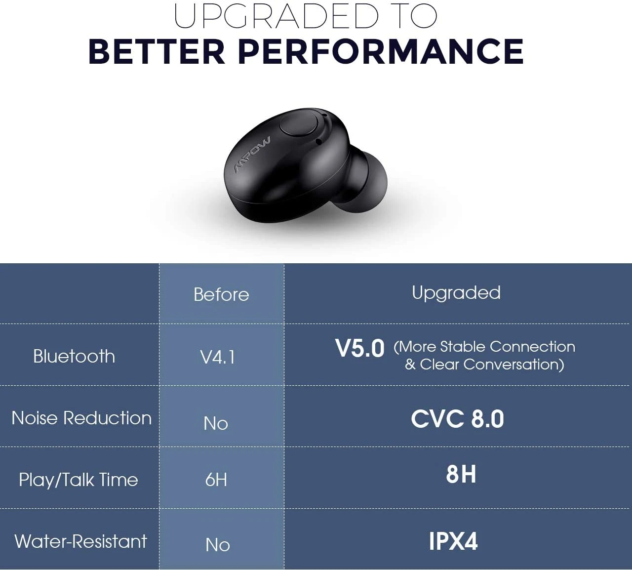 - cVC 8.0 NOISE CANCELING MIC: Built-in cVc™ 8.0 noise-canceling mic, Mpow upgraded Bluetooth earpiece offers hands-free calls with crystal-clear sound, which can filter out external noise & enhances the sound of your voice, allow you hear and be heard in louder environments.