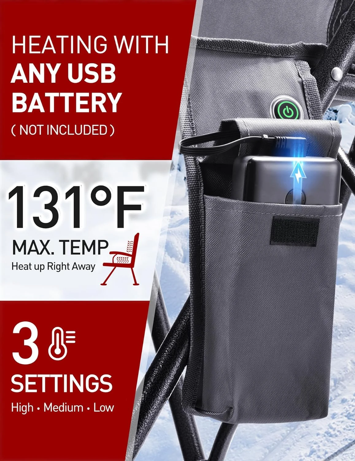 - 【𝐃𝐔𝐀𝐋 𝐇𝐄𝐀𝐓𝐈𝐍𝐆 𝐙𝐎𝐍𝐄𝐒】 The battery heated camping chair quickly warms up both your back and seat (some chairs only have ONE heating area). 3 heat settings (131°F/ 113°F/ 104°F) allow you to adjust the temperature according to your liking. Works with ANY USB battery pack, battery NOT included