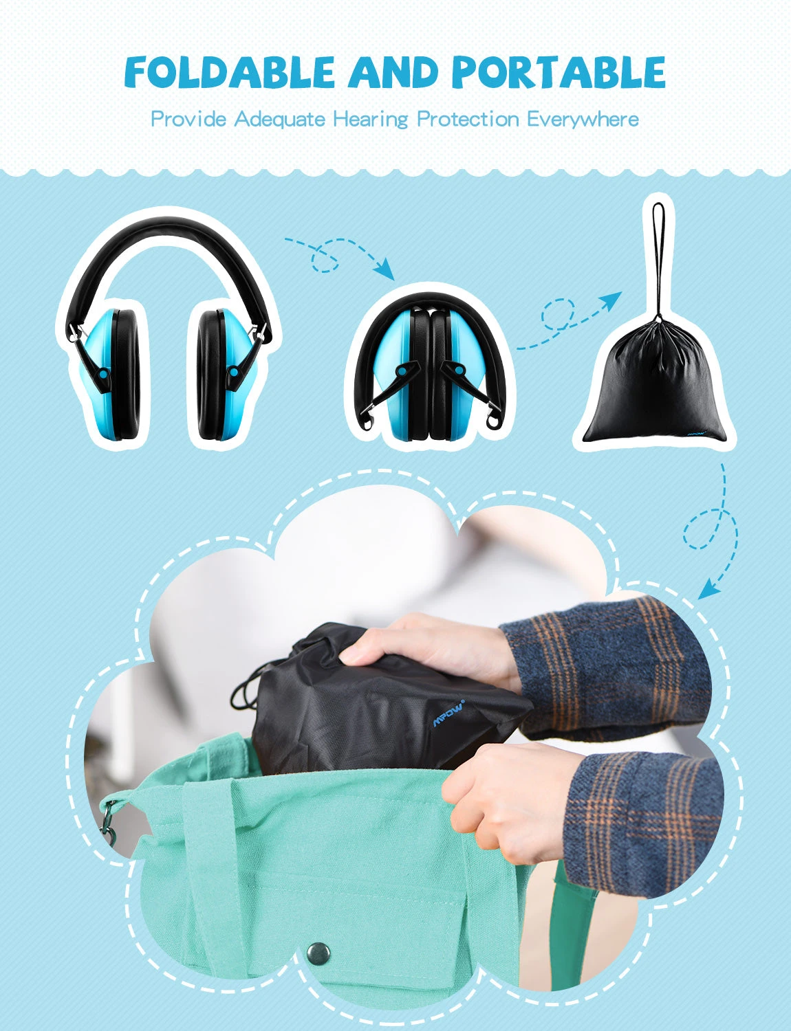 COMPACT AND COMFORTABLE: The toddler hearing protection folds up easily into the headband. The compact folding design for storage and a travel drawstring bag is included for easy packing.