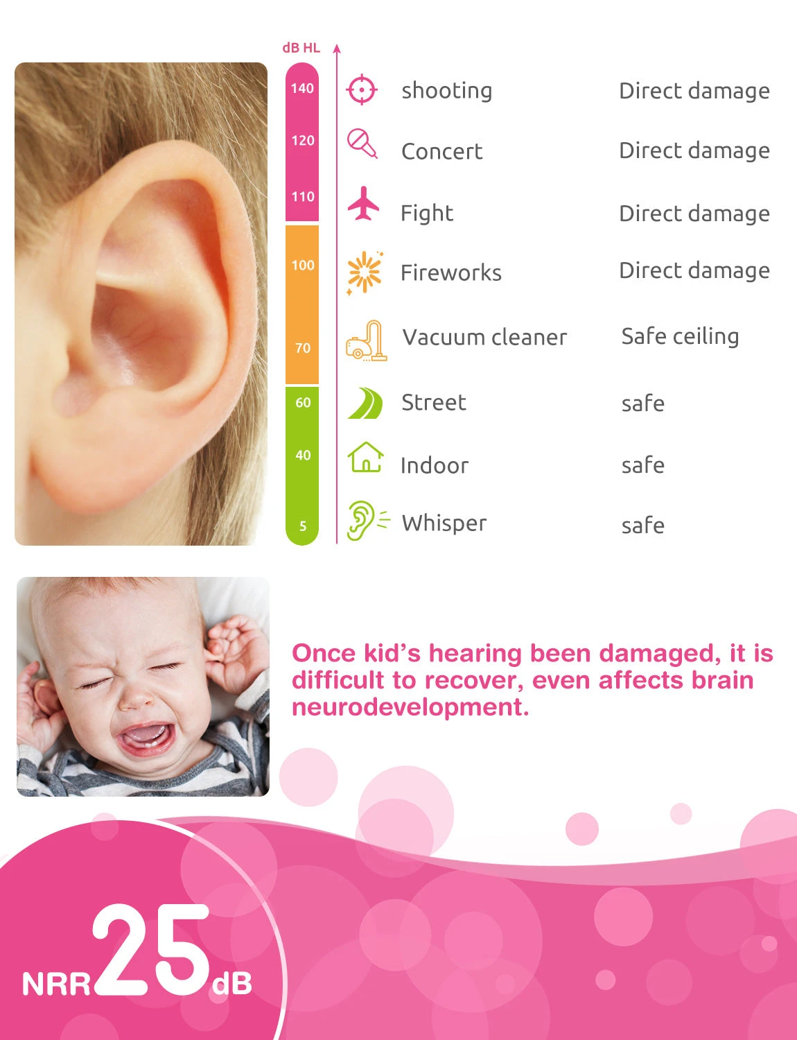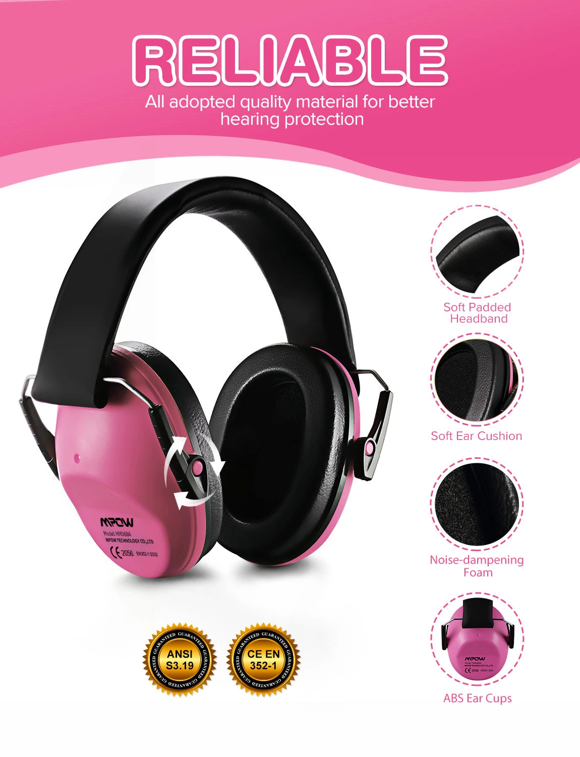 ANSI S3. 19 & CE EN 352-1 certified: Certified by ANSI and CE, Mpow kids hearing protection ear muffs is able to reduce the surrounding noise by 25dB, thus to protect child’s hearing from potentially harmful effects of exposure to loud noise.