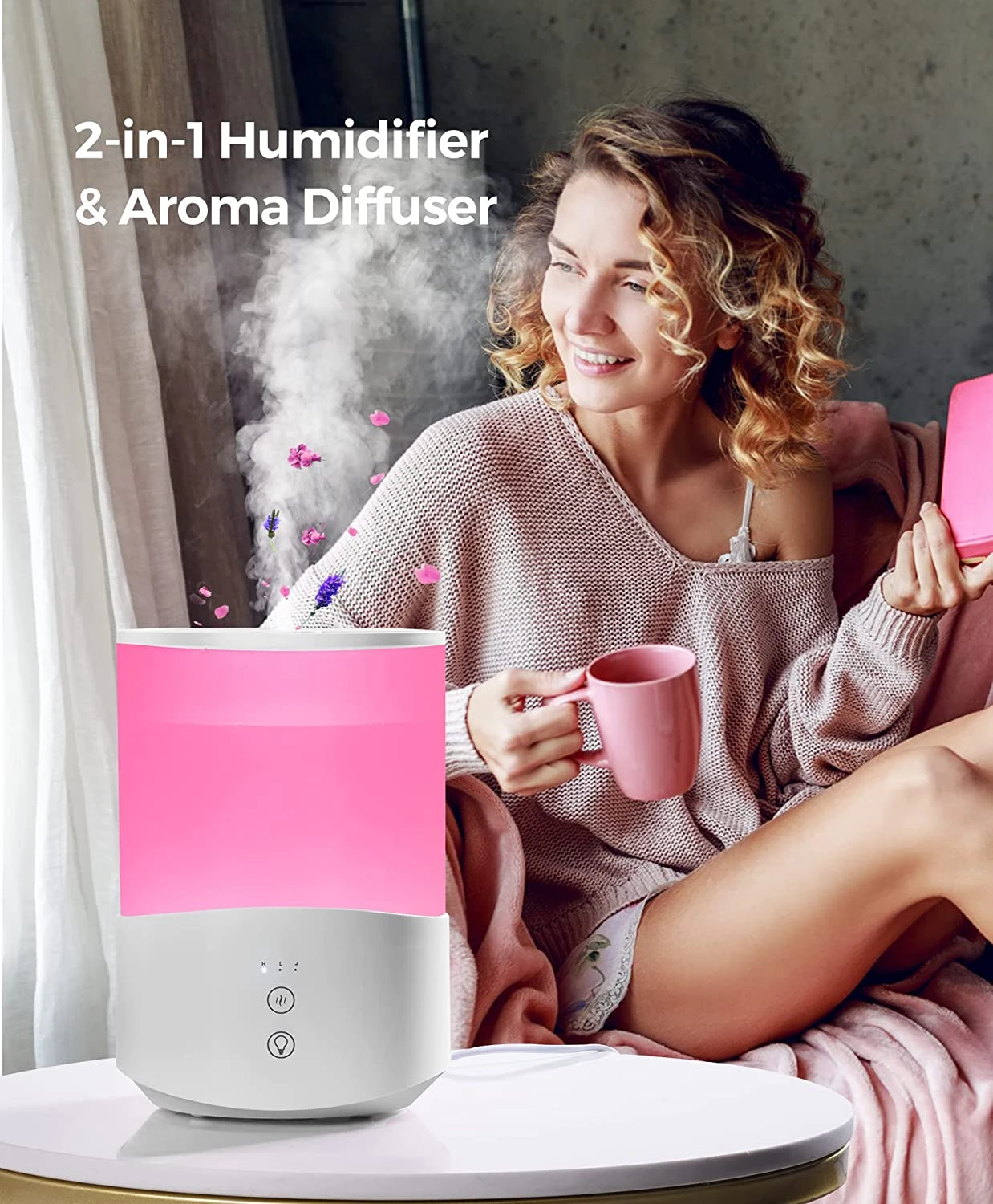 BY USING OUR COOL MIST HUMIDIFIERS FOR BEDROOM, IT TRANSFORMS DRY ROOMS INTO COMFORTABLY PERFECT ONES. This helps support better sleep quality and your overall well-being. The 2-in-1 top-filling humidifiers for bedroom & aroma diffuser has a large capacity water tank (2.5L/0.7Gal) covering rooms up to 290 sq ft and lasting for up to 28 hours a whole day and night.