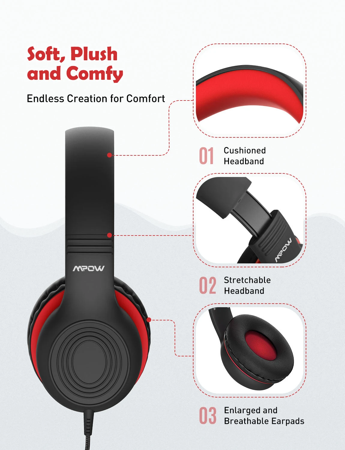 - HD Stereo Sound & Noise Isolation: Dual 40mm drivers of mpow kids headphones for school deliver crisp and clear sound for better enjoyment. Mpow kids headphones with larger and thicker soft earmuffs, which can isolate 50% of the noise in the 4~6kHz band. It is not only improves call quality by 30%, but also effectively protect kids’ ears from impairing.