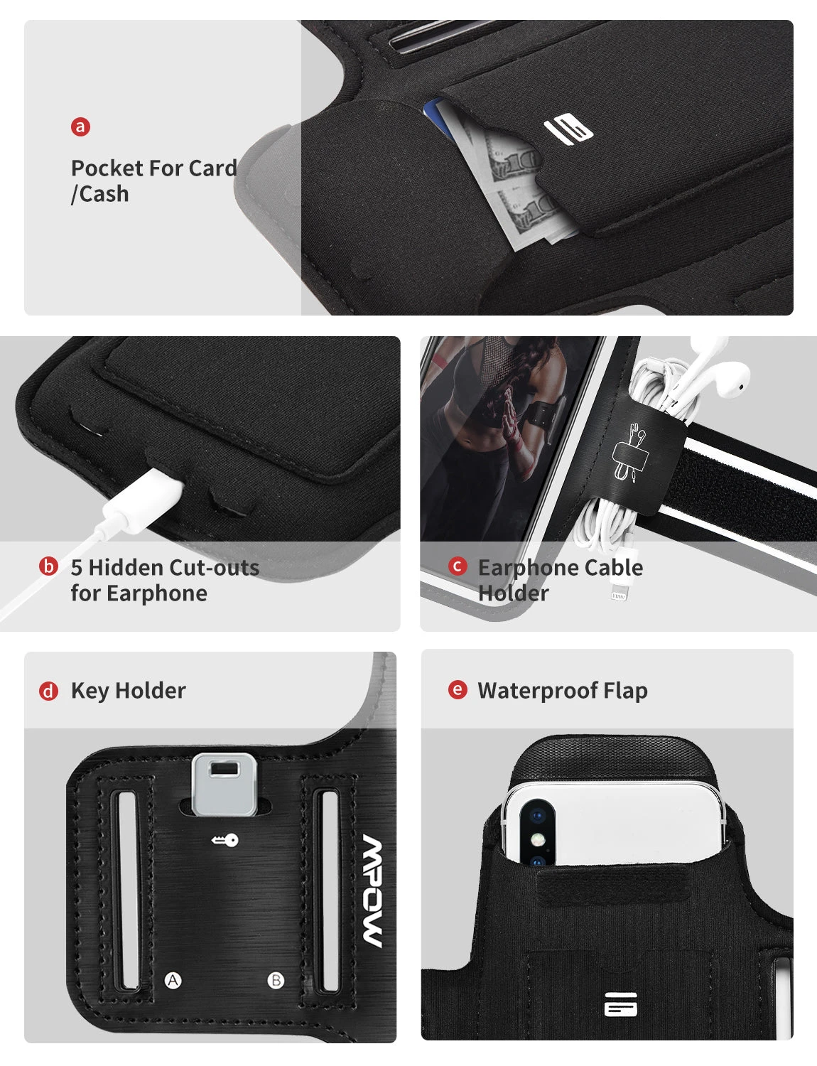 HAND FREE RUNNING: Mpow running armband gives back pocket, key holder and the earphone wire holder for convenient storage. A small back pocket is useful for storing cash, ID, credit cards and your other small Essentials. Just take one running armband outside and worry-free your belongings.