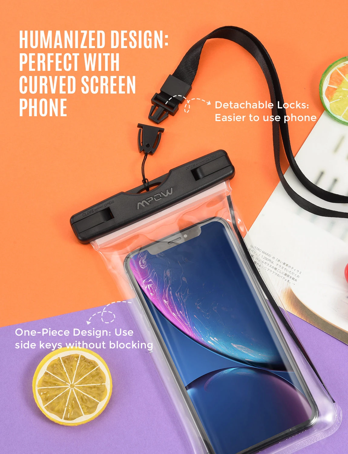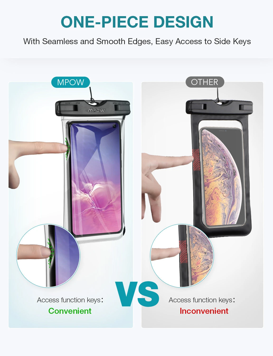 - INNOVATIVE TRANSPARENT CURVED SIDE: Edge-smoothing waterproof phone pouch it is easy for you to use SIDE-KEY under the water. The all transparent waterproof phone case perfect for taking pictures and videos underwater, capturing every meaningful moment in your life. NOTE: Phones with large otter boxes are not recommended in this bag!