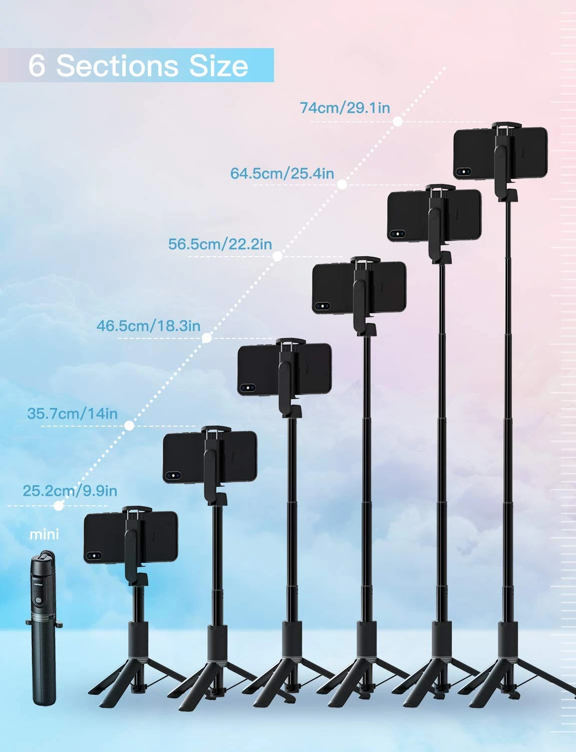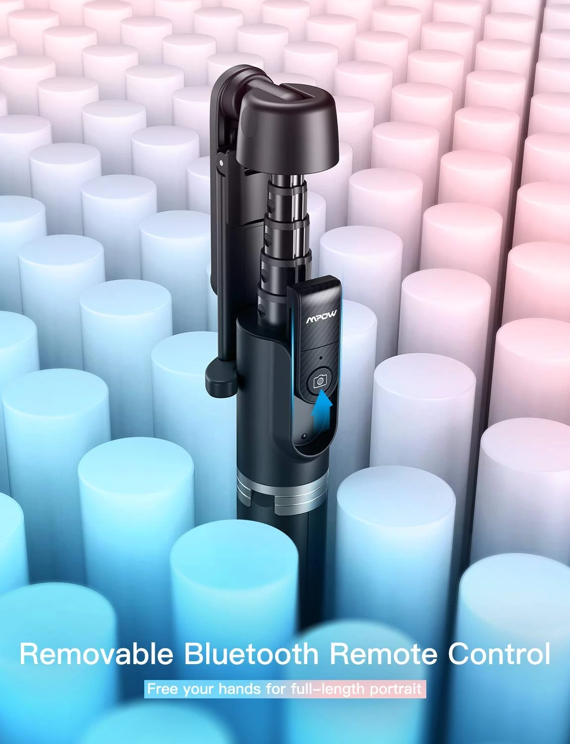 QUICK CONNECTION AND SNAP: Just connect the selfie stick tripod via Bluetooth and you’re ready to go. There is a removable wireless remote control that can capture group photos or videos from up to 10m/33ft away, you do not need to hunt for strangers to take pictures of you.