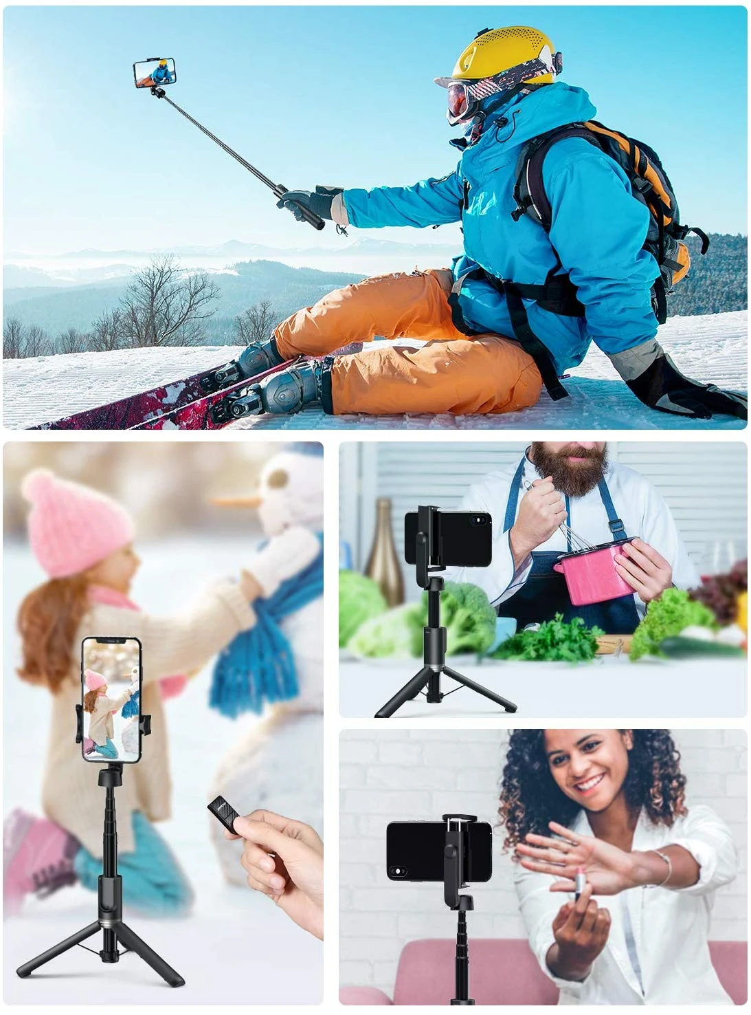 2020 INNOVATION SELFIE STICK TRIPOD: Integrated 3-in-1 selfie stick accompanied by wireless remote and retractable tripod stand. Each leg of the tripod stand is reinforced with a support bracket. Perfect for travel, family vacation, trip, after-graduation trip, Vlog, party, family gathering. NOTE: The lower the height of the extendable rod, the better the stability.