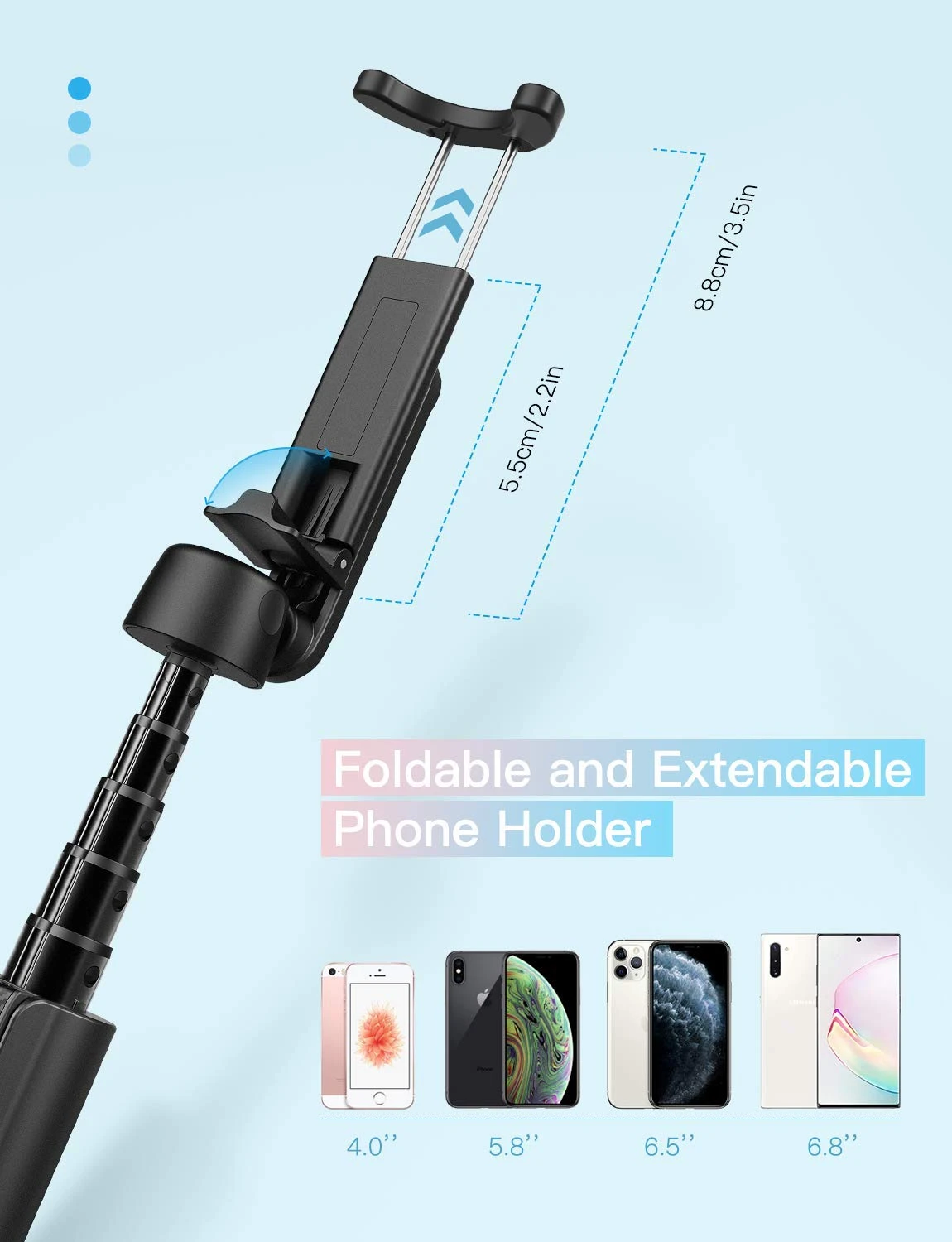 UNIVERSAL SELFIE STICK TRIPOD FOR ALL CELL PHONES: The adjustable clamp securely holds phones from 21. 7in to 34. 6in in width, Compatible with iPhone 11 Pro Max/11 Pro/11/Xs/Xs Max/XR/X/8 Plus/8/7 Plus/7/6, Galaxy Note 10+/Note 10/S10/S10+/Note 9/S9+/S9/Note 8/Note 5/S8+/S8, Google Pixel/Nexus and more phones with or without a case.