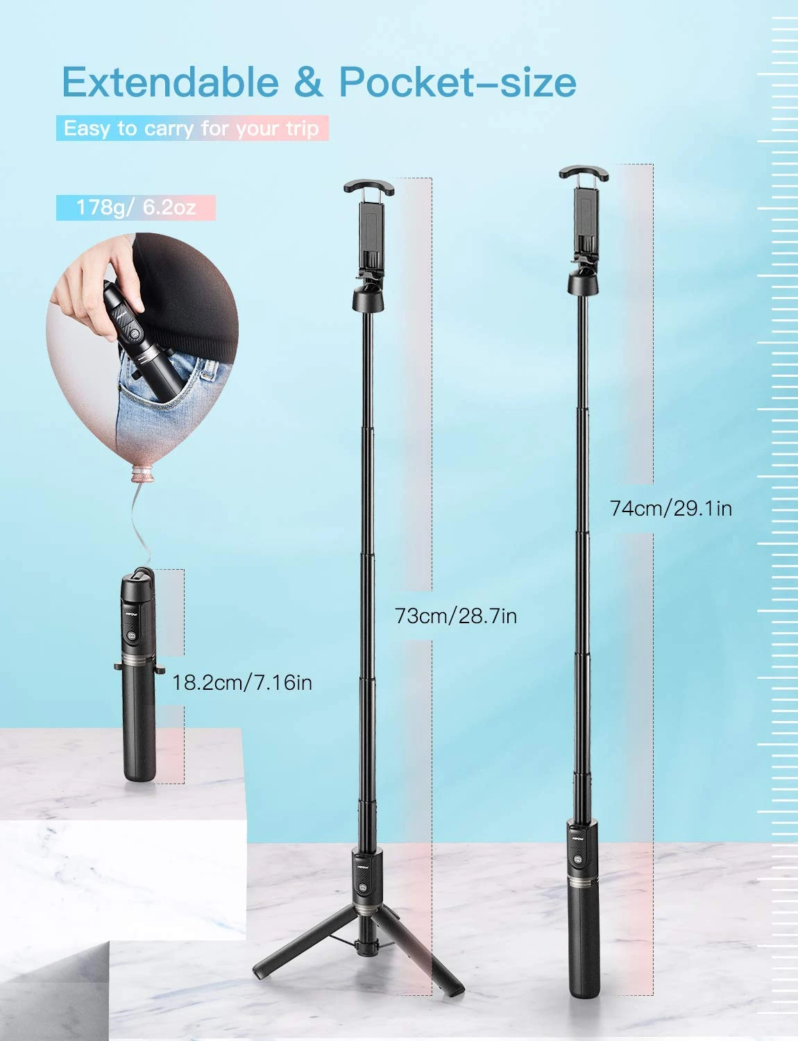 EXTENDABLE & FOLDABLE SELFIE STICK FOR CELL PHONES: This selfie stick tripod can be extended between 7. 9 to 27 inches, which makes it very suitable for Photograph, Facetime, Business and more. It allows for a wider group picture and longer shot. A good phone tripod should be compact in size and light in weight when folded so that you can put it in your pocket or purse.