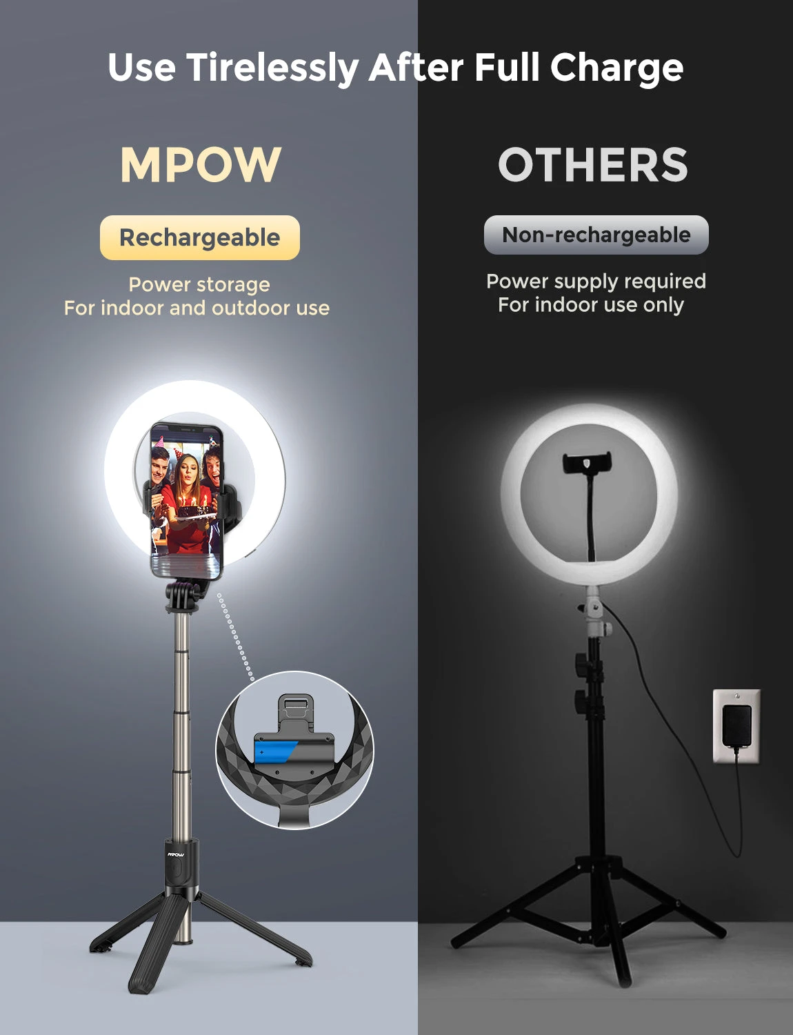 PORTABLE & STABLE: Mpow LED ring light with tripod stand extends from 19.5cm/7.7in to 74.5cm/29.3in. Weighing only 10.4 oz/296 g, you can carry the light wherever you go. The tripod is stable enough to be placed on the table or the ground for live streaming or shooting.