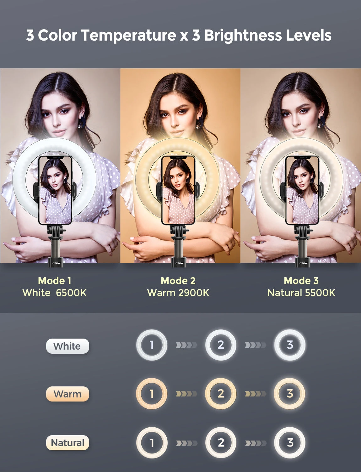 3 LIGHT COLOURS & 3 BRIGHTNESS LEVELS Light Colours: Mpow LED ring light with tripod stand has 3 colour options: white, warm, and natural, in addition to 3 brightness settings for each colour (9 settings in total), which gives your picture/video a major boost while blurring imperfections and reducing unwanted shadows. Whether you’re taking selfies, makeup, or live streaming, Mpow dimmable LED ring light can brighten up your face in dim lighting conditions.