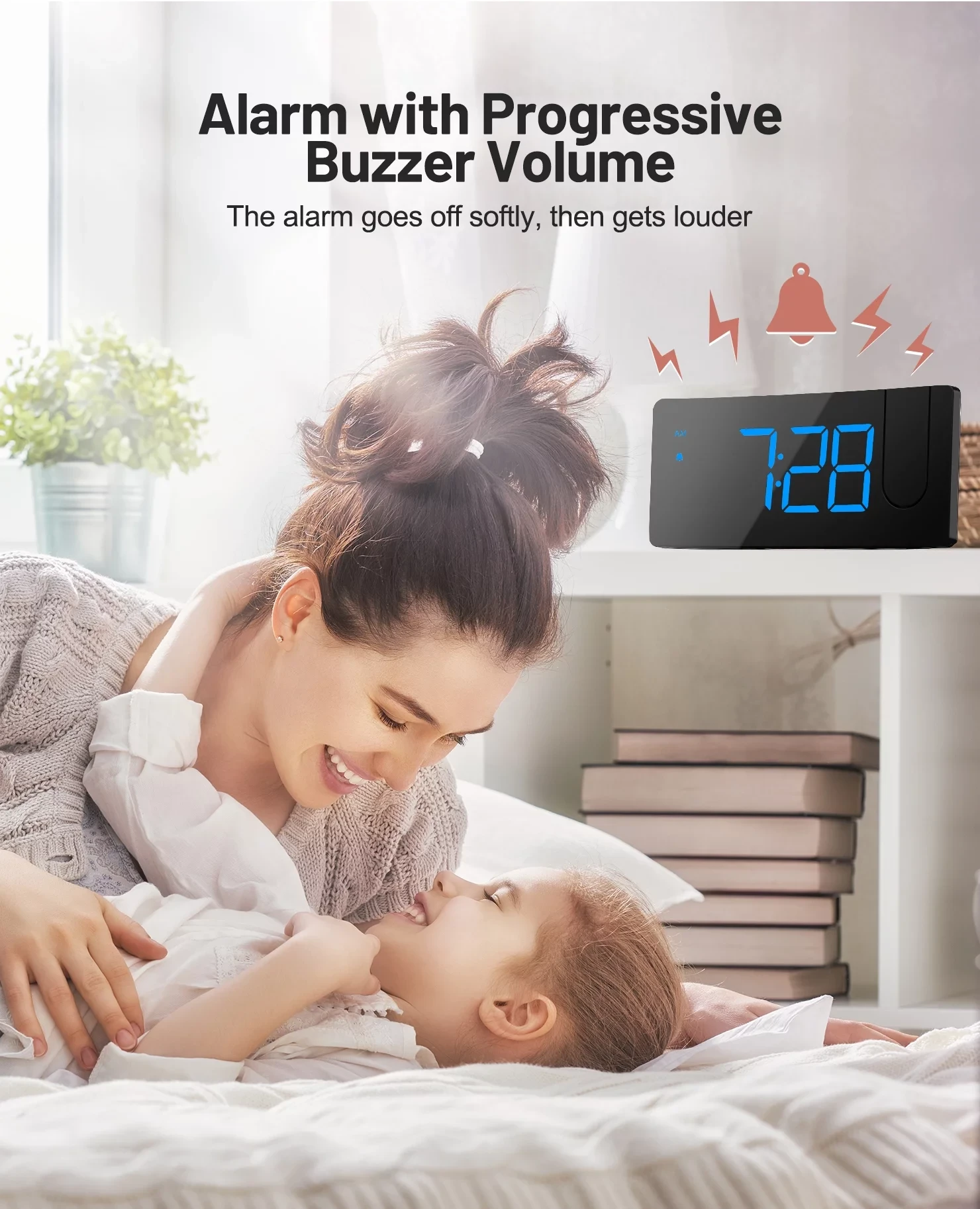 - ALARM WITH PROGRESSIVE BUZZER VOLUME — This particular projecting alarm clock for bedrooms comes with a progressive buzzer volume, friendly for heavy sleepers who won’t get used to the sudden loud sound. And pressing the big SNOOZE summary at the top, you can get extra precious 9 minutes of sleep till the next loop of this alarm.