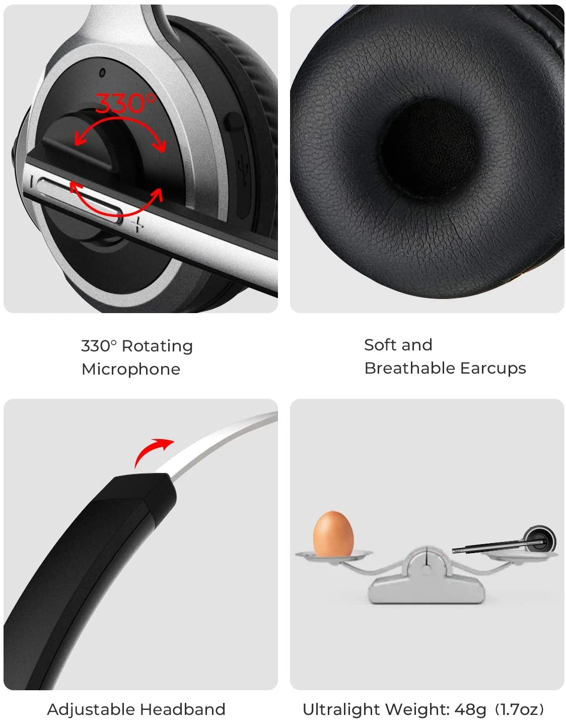 All Day Comfort: The bluetooth headphones weight only 0.11lb. With over-the-head wearing style and breathable protein earmuffs, our office headset allows you to wear for hours without getting a headache.