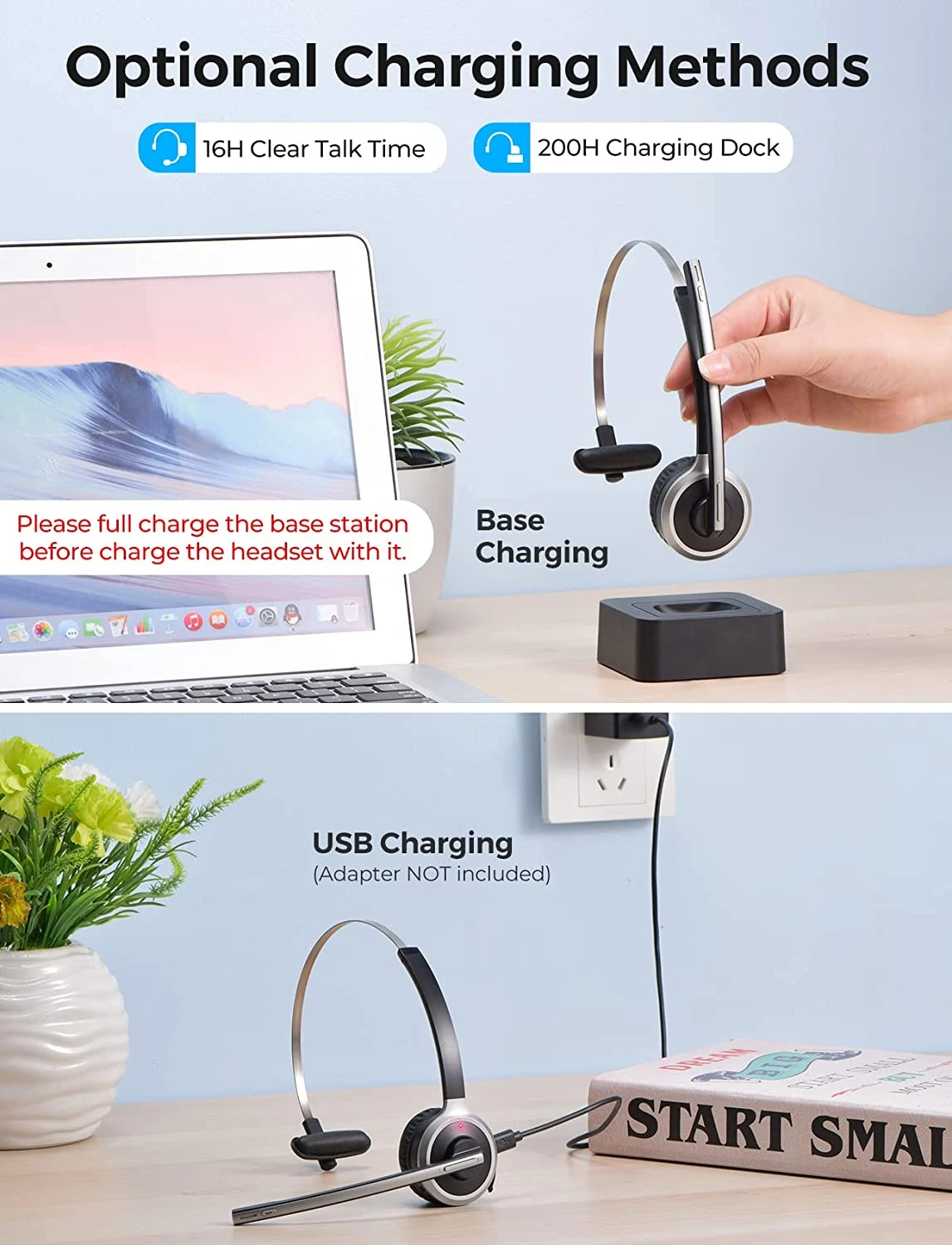 - ☎200+ Hours Working Time: Say goodbye to frequent recharges, you’ll get a full 216 hour work time with our Wireless Headset with Microphone for PC, that’s enough for weeks of use time. A single charge gives you a full 16 hours of talking/music time, while the charging dock offers up to 200 hours extra playtime when fully charged. You can always stay online and stay productive.