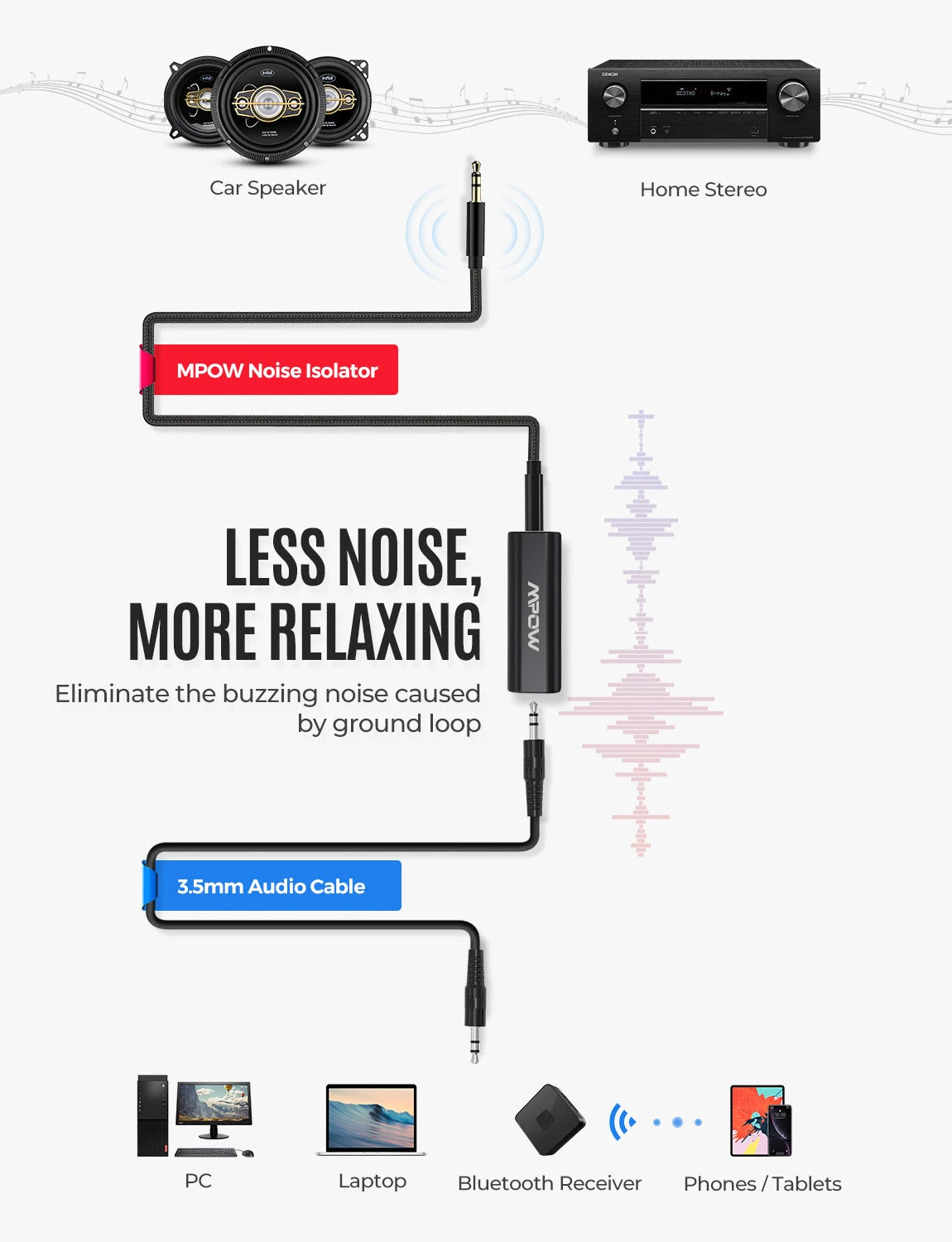 - Eliminating buzzing noise: eliminating the buzzing noise, caused by ground loops which happens when the audio source and the speaker use the same power source in some car speakers/ home stereo systems When using the Bluetooth receiver.