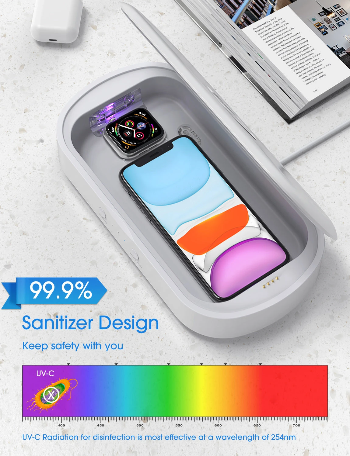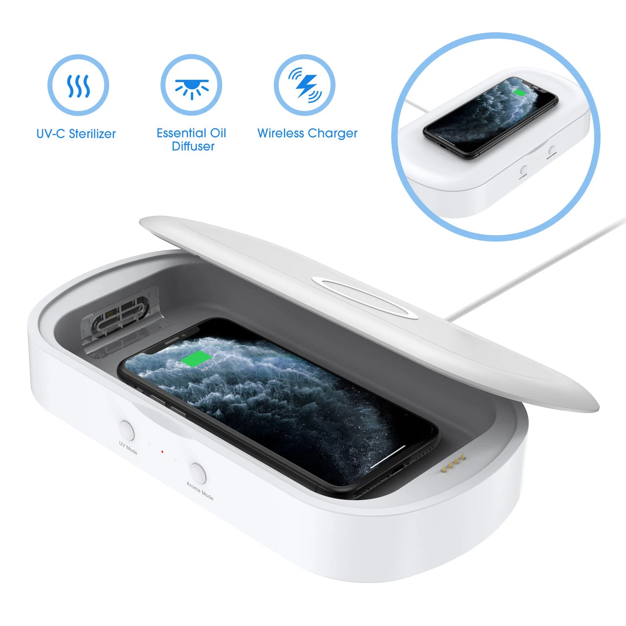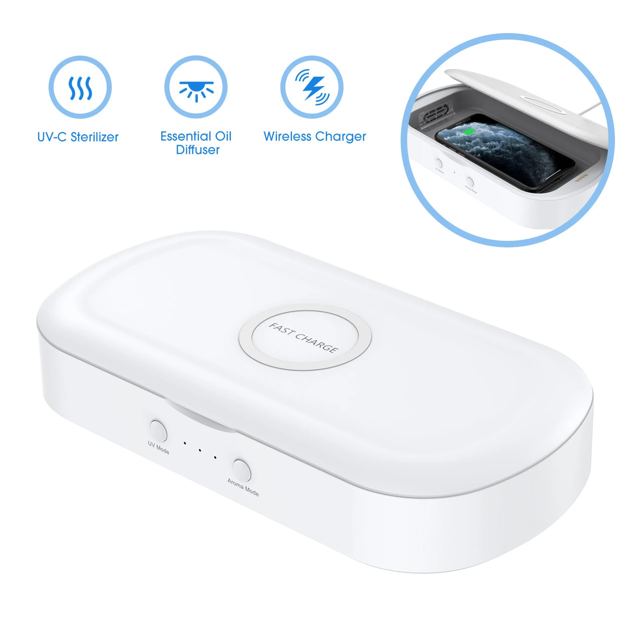 Prevention First: The UV-C bulbs built into the sanitizer to purify the items without liquid and high temperature, which effectively reduces the risk of revealable objects. Put your belongings into the box and press the UV Mode summary to continuously start the 5min sanitization.