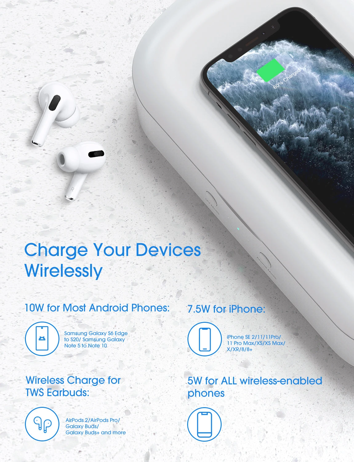 Charge Your Devices Wirelessly: The silicone circle on the top is the wireless charger spot for wireless charging, compatible with all wireless-enabled devices, provides up to 10W in maximum charging for your phones and earbuds. Please Note: Charge with a high-powered QC 2.0/3.0 wall adapter, NOT included in a package, the 5W adapter is NOT RECOMMENDED; The wireless charger is compatible with wireless-enabled devices only.