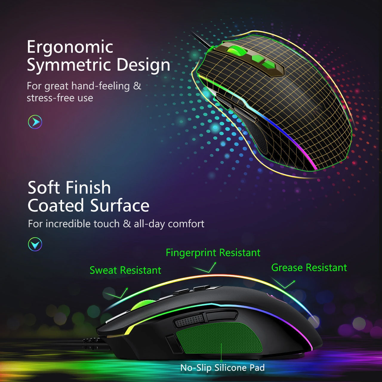 Equipped with 8 Fully-Programmable Buttons(Total 9 summarys) and On-Board Memory to save profiles,the DSR RGB enables extensive customization and portability.On-The-Fly DPI Switching adapts your mouse sensitivity to the situation for total command in every environment.